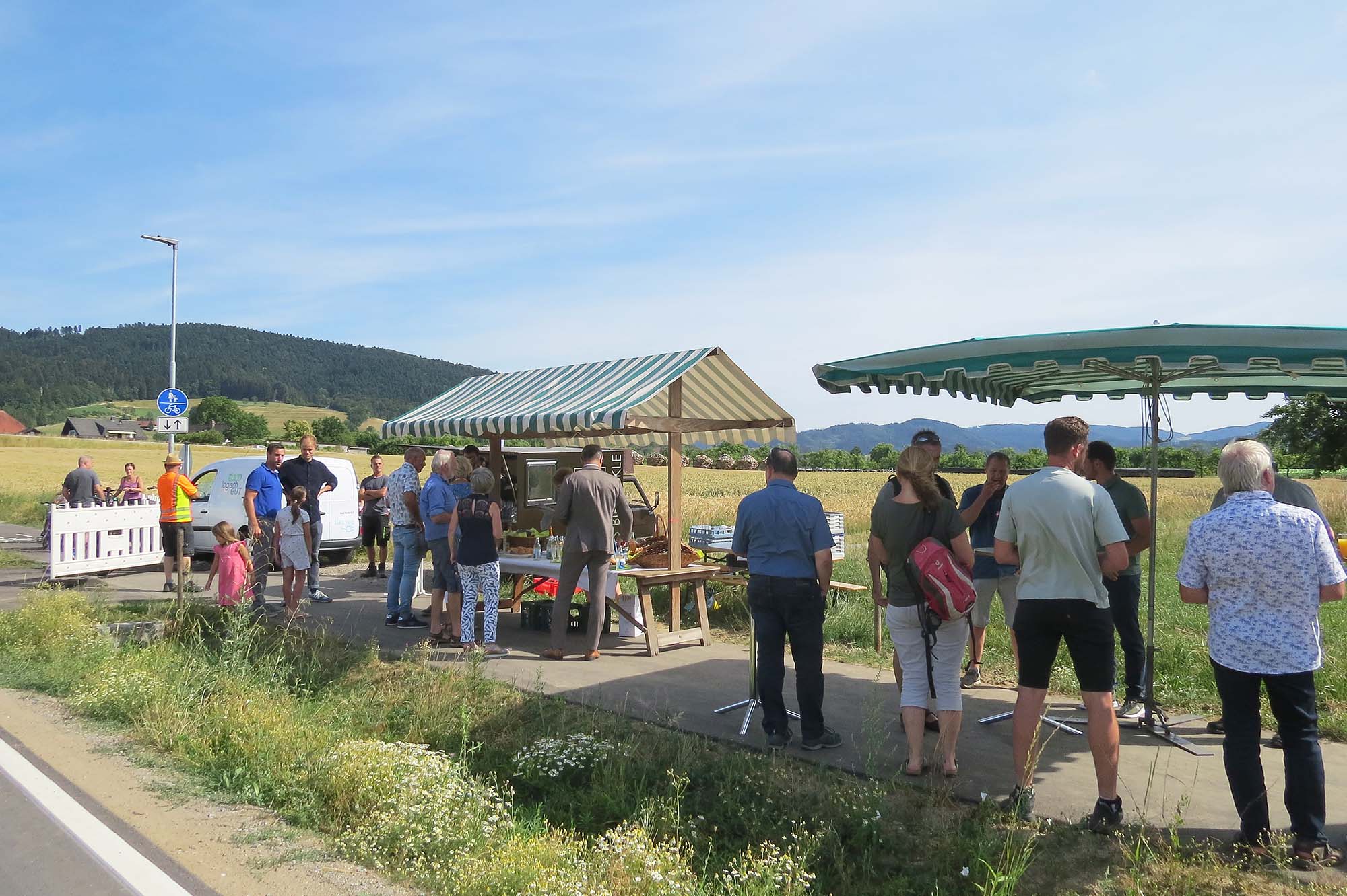 Passend zum Anlass feierte man direkt auf dem Radweg, der dafür kurzzeitig gesperrt wurde. Der Betriebshof hatte mit Sonnenschirmen für Schatten gesorgt und es gab einen Imbiss und kalte Getränke, gesponsert von der Stadt Zell. Die Unterentersbacher Bierbrauerei war ebenfalls mit ihrem mobilen Verkaufswagen da. Bürgermeister Günter Pfundstein, Ortschaftsräte und Gemeinderäte, die beteiligten Handwerker und Planer sowie Vertreter der Betriebshofs und natürlich Bürger aus Unterentersbach waren zur Einweihungsfeier gekommen.