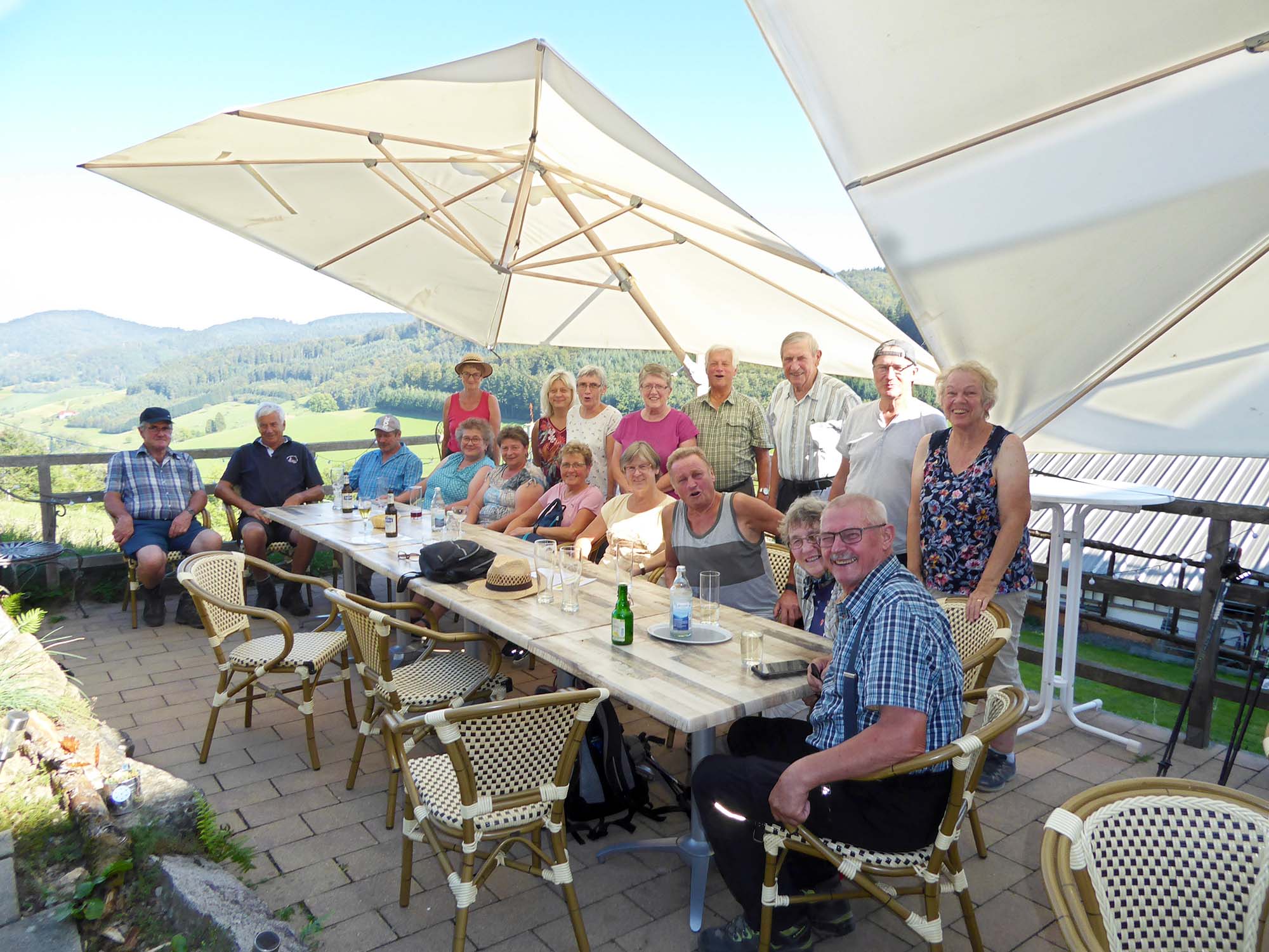 Im Schatten großer Sonnenschirme ließ man es sich auf Terrasse gut gehen, genoss die herrliche Aussicht ins Tal und Leckeres aus Küche und Keller. Einige Wanderfreunde waren noch dazugekommen, sodass man in froher Runde eine schöne Zeit verbrachte und der Aufbruch etwas schwerfiel.