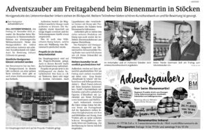 - Anzeige -Anzeige, Zell-Unterentersbach | 22.11.2023 Adventszauber am Freitagabend beim Bienenmartin in Stöcken von Hanspeter SchwendemannHonigprodukte des Unterentersbacher Imkers stehen im Blickpunkt. Weitere Teilnehmer bieten schönes Kunsthandwerk an und für Bewirtung ist gesorgt. Foto: privatDas könnte Sie auch interessieren:Foto: Ute BergerAdventszauber beim BienenmartinFoto: Fotos: Hanspeter SchwendemannBesucherandrang bei Bienemartins AdventszauberFoto: Archivfoto: Inka Kleinke-BialyBiberacher Weihnachtsmarkt lädt zum…