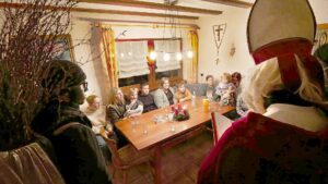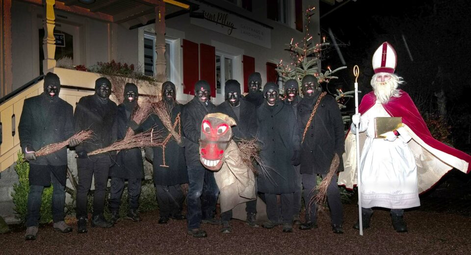 Ganz der Entersbacher Tradition entsprechend zog der Nikolaus in seinem roten Gewand, dem Bischofsstab und der Mitra auf dem Kopf mit seinen schwarzen Gesellen und dem Biggesel durch das Dorf. Mit Kettengerassel und lautem „Heeaaahhh“ zogen sie bei Dunkelheit durch die Straßen, so wurde der Nikolaus schon weithin hörbar angekündigt.