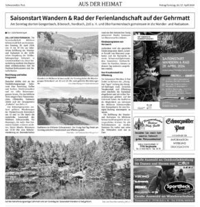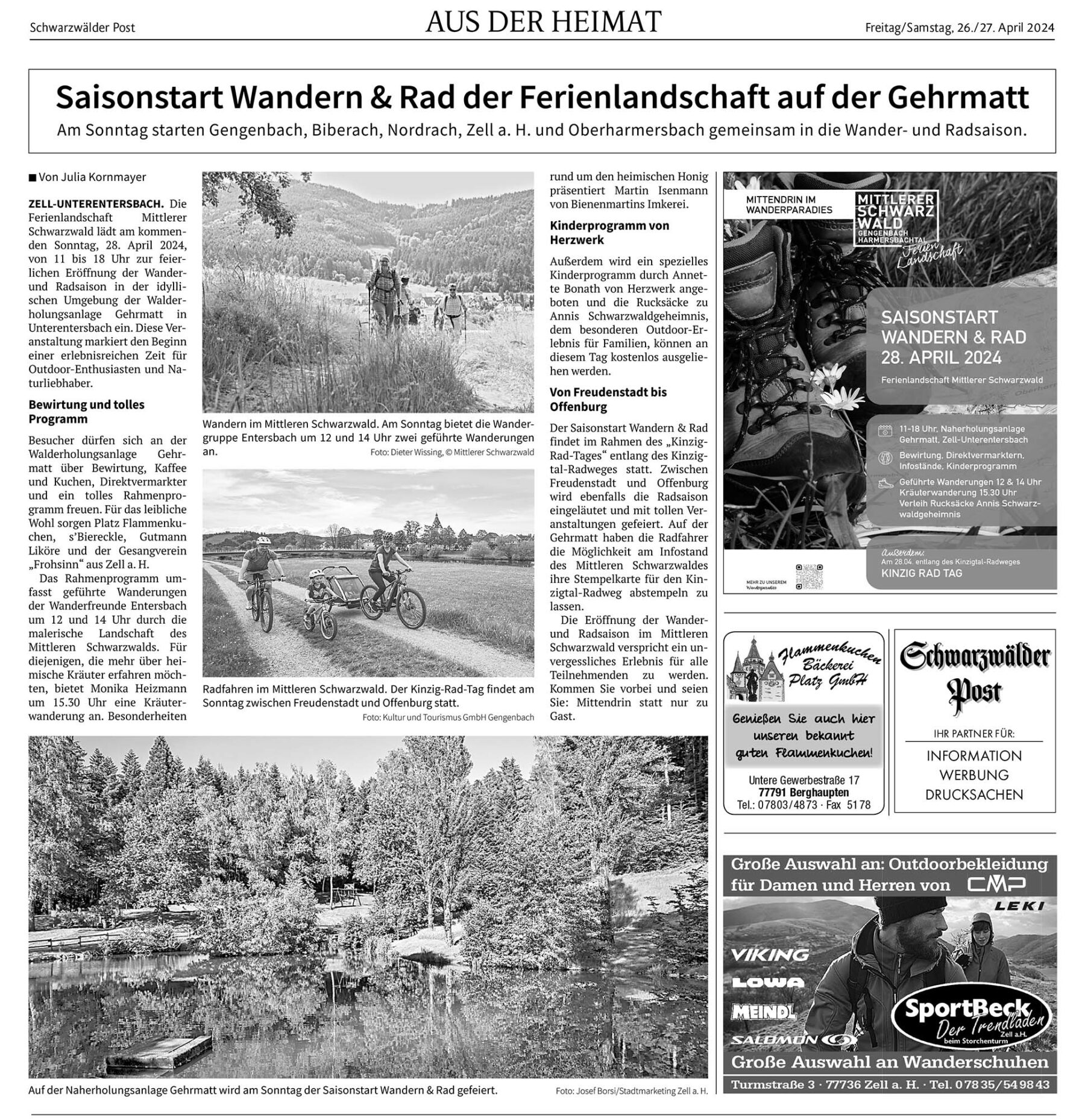 Zell-Unterentersbach | 26.04.2024 Saisonstart Wandern & Rad der Ferienlandschaft auf der Gehrmatt Foto:Auf der Naherholungsanlage Gehrmatt wird am Sonntag der Saisonstart Wandern & Rad gefeiert. Foto: Josef Borsi/Stadtmarketing Zell a. H. von Julia KornmayerAm Sonntag starten Gengenbach, Biberach, Nordrach, Zell a. H. und Oberharmersbach gemeinsam in die Wander- und Radsaison. Foto: Dieter Wissing, © Mittlerer Schwarzwald; Kultur und Tourismus GmbH Gengenbach; Josef Borsi/Stadtmarketing Zell a. H.Das könnte Sie auch interessieren:Foto: Lehmann-ArchivKaum Lücken im VeranstaltungskalenderFoto: Peter BaumannSchachclub Zell stürmt die Burg in HornbergSKC Nordrach 1 siegt im Kellerduell