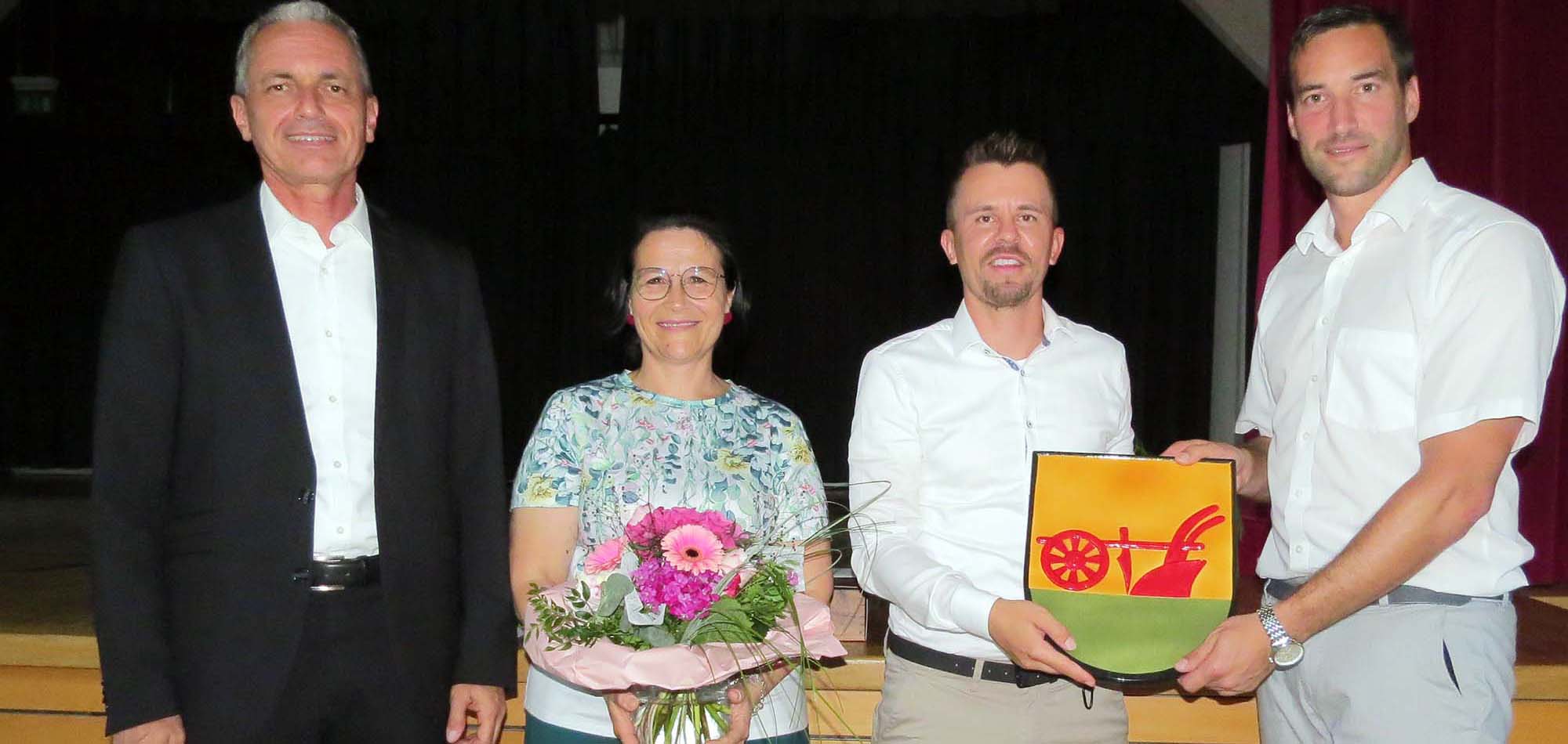 Verabschiedet aus dem Ortschaftsrat wurden Michaela Moser und Matthias Bruder. Ortsvorsteher Christian Dumin dankte ihnen mit herzlichen Worten und Präsenten für ihr Engagement. Von links: Bürgermeister Günter Pfundstein, Michaela Moser, Matthias Bruder und Ortsvorsteher Christian Dumin. Foto: Gisela Albrecht
