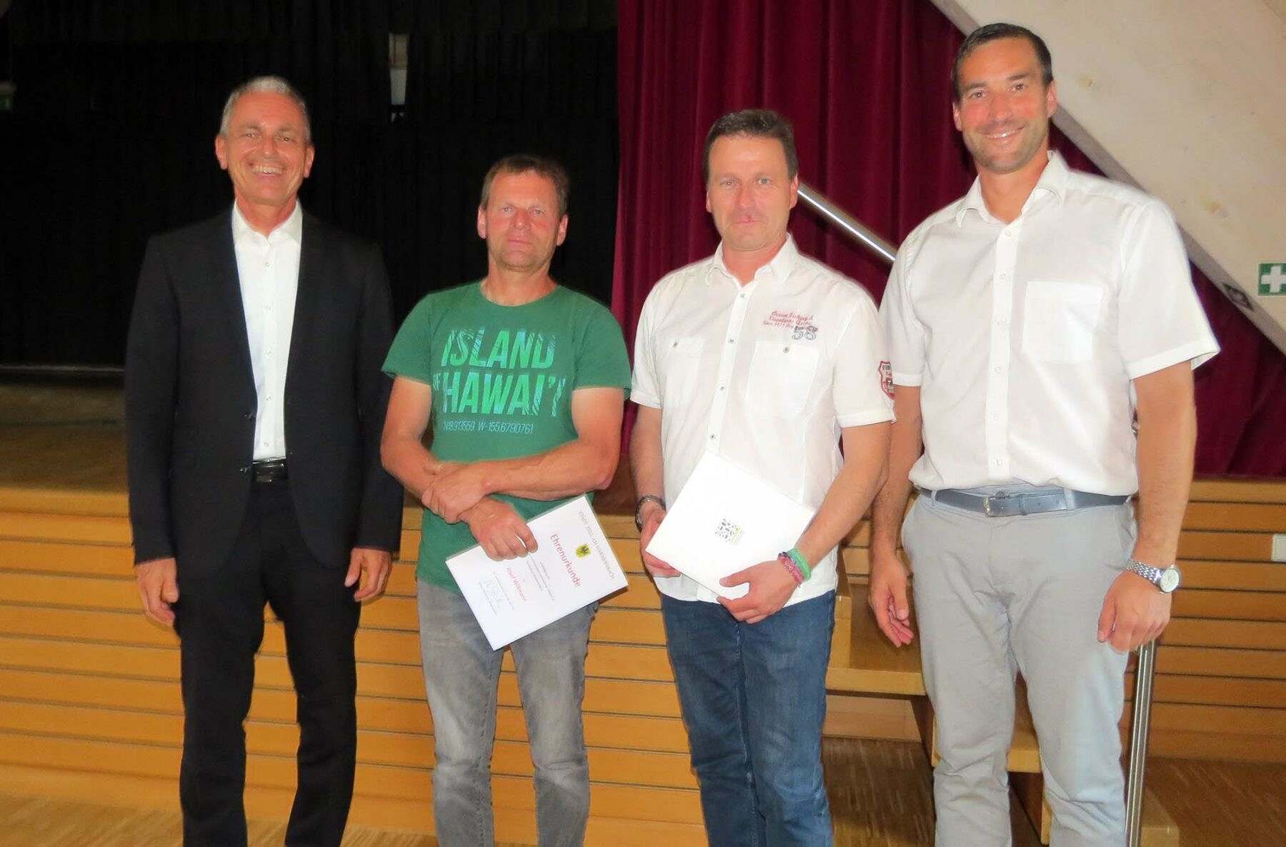 Für ihre langjährige Mitarbeit im Ortschaftsrat wurden Josef Willmann und Michael Wurtz geehrt. Josef Willmann ist seit 15 Jahren ehrenamtlich tätig; Michael Wurtz seit 10 Jahren. Sie erhielten Urkunden und den Applaus der Anwesenden. Von links: Bürgermeister Günter Pfundstein, Josef Willmann, Michael Wurtz und Ortsvorsteher Christian Dumin.