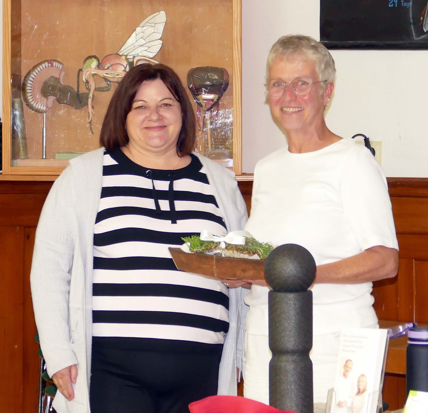 In der Runde zeigte Frau Meßmer einige Techniken, die speziell auf alltägliche Beschwerden zugeschnitten sind, und lud die Teilnehmerinnen zum Mitmachen ein. Viele Fragen rund um Schmerzprobleme wurden beantwortet, und die passende Übung gleich demonstriert. Meßmer betonte, dass sie auch über den Vortrag hinaus gerne für Fragen zur Verfügung steht. Sabine Damm vom Vorstandsteam bedankte sich herzlich bei der Referentin für den informativen Vortrag und überreichte ein kleines Präsent.
