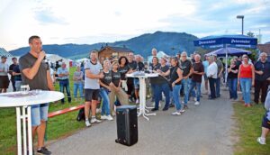 Gegen 19:30 konnte dann Ortsvorsteher Christian Dumin eine kleine Ansprache halten. „Alle waren in den vergangenen Wochen sehr eingespannt und auch angespannt“, stellte der Hauptorganisator des Jubiläumsfestes fest und weckte die Vorfreude auf den Sonntag. Das Dorf ist super hergerichtet. Unterentersbach zeigt sich von seiner allerbesten Seite. Auch viele Aktive zeigen in UE- und OE-Shirts, dass sie sich mit dem Ort identifizieren.