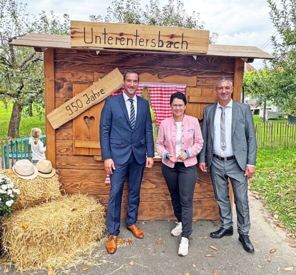 rinnerungsfoto an das Jubiläumsfest in der Fotobox auf der Apfelweise: Justizministerin Marion Gentges zusammen mit Ortsvorsteher Christian Dumin und Bürgermeister Günter Pfundstein. Foto: Jürgen Isenmann