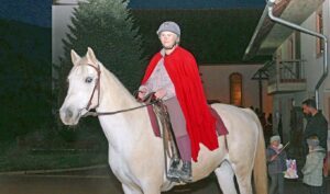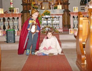 Gemeindereferentin Julia Schätzle begrüßte alle Kinder, Erzieherinnen und Erzieher, Eltern und Großeltern zum Wortgottesdienst in der sehr gut besuchten Nikolauskirche. Begonnen hatte der Gottesdienst traditionell mit dem St. Martinslied. Danach erzählte Julia Schätzle die Geschichte vom heiligen Martin. Nach der überlieferten Legende ritt Martin mit seinem Pferd an einem kalten Wintertag an einem frierenden Bettler vorbei. Da ihm der Mann leidtat, teilte Martin seinen Mantel und schenkte dem Bettler die Hälfte davon. Diese Szene wurde von den Schulanfängerkindern Lara Hannemann und Joshua Schwendemann gespielt.