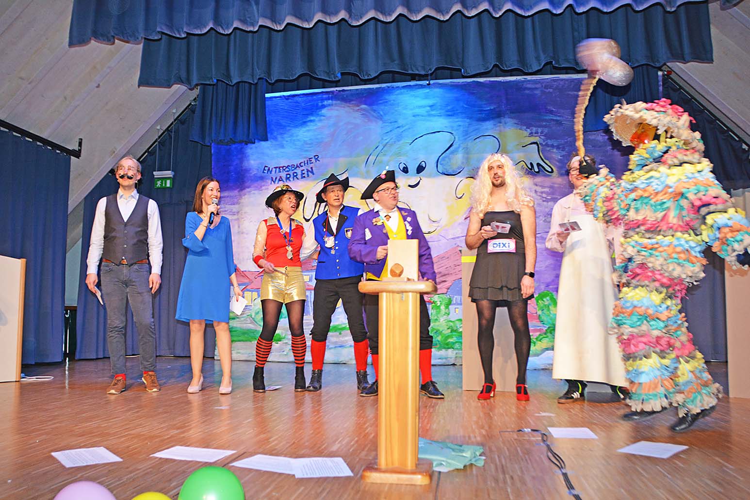 Was keiner wusste: Mit dem neuen Konzept heißt es für die Zeller Fasend „Platzwechsel“! Der Umzugsweg führt jetzt vom Gröbernhof über das Waldhorn durchs Dorf bis nach Stöcken. Eine Strecke ohne Wiederholungen und mit genügend Wirtschaften. Und das Bändele kommt an seinen Ursprungsort zurück, dahin wo es entstanden ist. Nämlich bei der Papierfabrik im Entersbach. Da schallte es durch den Saal und das ganze Narrenvolk stimmte mit ein: „Es kunnt jetzt heim, es kunnt jetzt heim, ‘s Bändele kunnt heim…“
