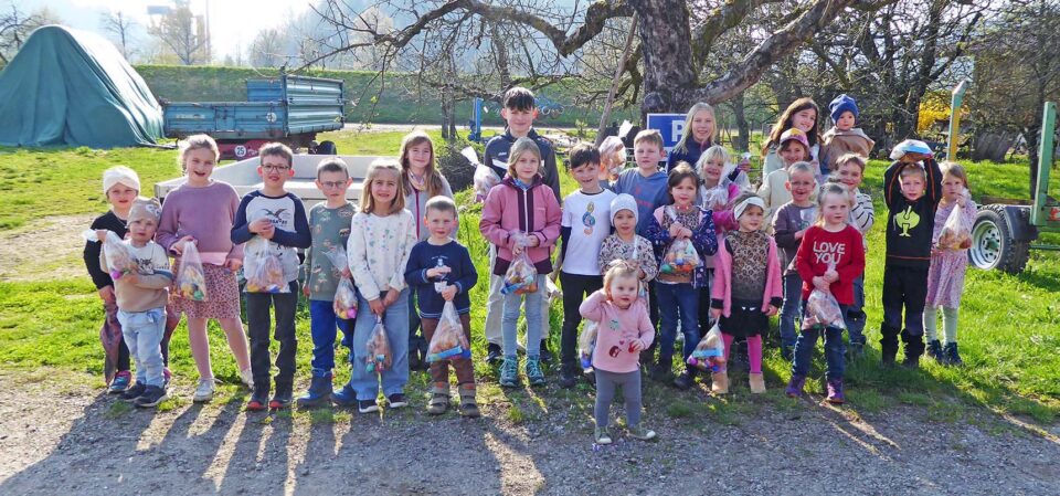 Bis auf den letzten Platz besetzt war die Vesperstube der Kinzigbrennerei, als alle Wanderer den ersten Durst löschten und in dieser Zeit die Osterhasen 29 Geschenktüten verstecken mussten. Auf Kommando stürmten die Kinder auf die Wiese, und rasch waren die meisten Verstecke geplündert. Mit Hilfe von Eltern und großen Geschwistern wurde schließlich alles gefunden, und die Hasjäger stellten sich zum Gruppenbild auf.