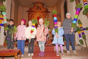 In der voll besetzten Nikolauskirche segnete Pfarrer Bonaventura Gerner die Palmen im Altarraum. In der Lesung sprach er vom feierlichen Einzug Jesu von Nazareth in Jerusalem. Die Menschen reagierten unterschiedlich: Die einen jubelten ihm zu, die anderen lehnten ihn ab. Die letzten Tage Jesu auf Erden spalteten die Menschen. Am Ende wurde er verspottet, erniedrigt, gefoltert und ans Kreuz geschlagen. Jesus trat seinen Leidensweg an – ein Weg, der auch an Erfahrungen im eigenen Leben erinnert. Anschließend wurde die Passionsgeschichte aus dem Matthäusevangelium von Pfarrer Gerner, Mesnerin Hilde Boschert und Cäcilia Schnaiter im Dialog vorgetragen. Der Gottesdienst endete mit dem Segen.