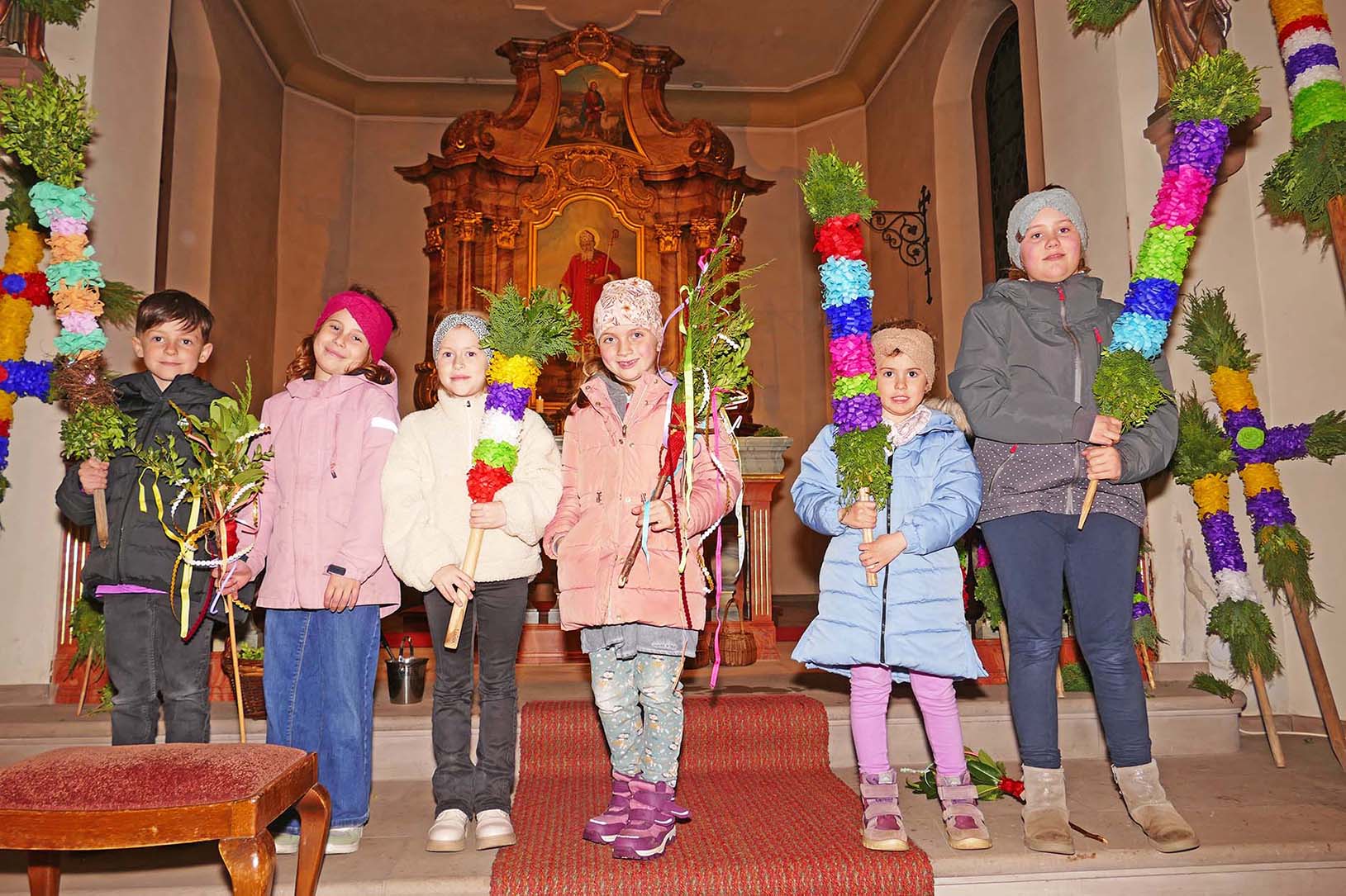 Mehr als 30 Palmstangen, Palmstecken und zahlreiche kleine Palmbüschel standen in der Kirche und schmückten den Altarraum. Die größten Palmen reichten bis unter die Kirchendecke. Mit viel Geschick hatten die Teilnehmer die Palmen gefertigt und kunstvoll mit buntem Seidenpapier verziert.
