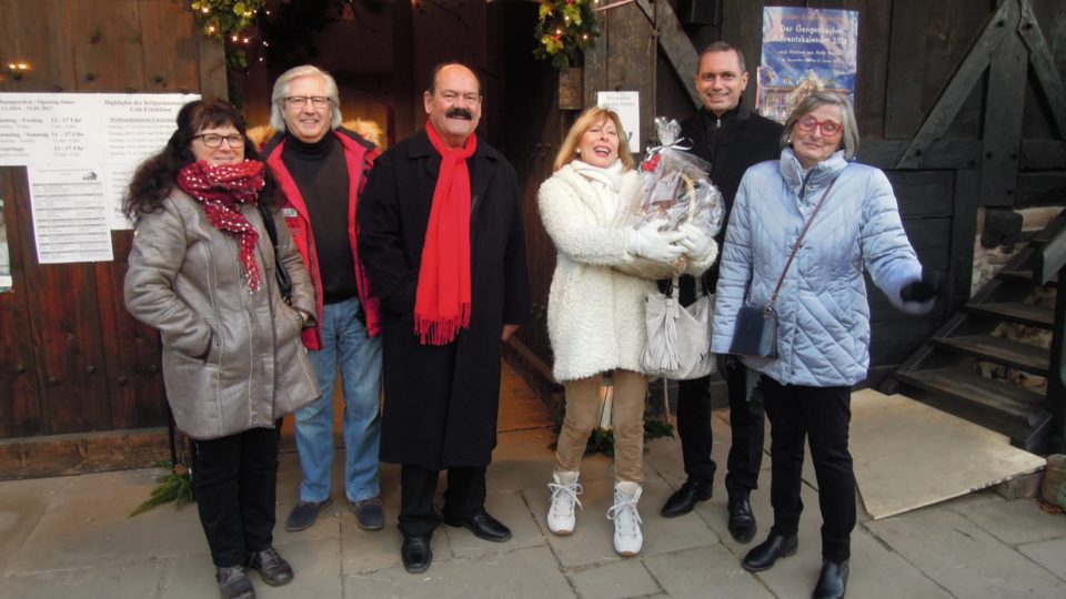 Barbara Wüst aus Rammersweier strahlte. Völlig überraschend bedachte sie noch im alten Jahr die Glücksfee. Als 10.000. Besucher der Krippenausstellung im Heimatmuseum Fürstenberger Hof durfte sie am Donnerstagnachmittag von Bürgermeister Günter Pfundstein und Ortsvorsteher und Ausstellungsleiter Hans-Peter Wagner einen prall gefüllten Schwarzwälder Vesperkorb entgegennehmen. Darüber freuen sich (von links) ihre Freundin Elke Maldacker, Biberach, ihr Ehemann Rolf Paffrath und ganz rechts ihre weitere Freundin Ruth Champion, die alle gemeinsam die Ausstellung besuchten. Sie alle werden sich in den nächsten Tagen zu einem zünftigen Schwarzwälder Vesper treffen, um das Ereignis zu feiern.