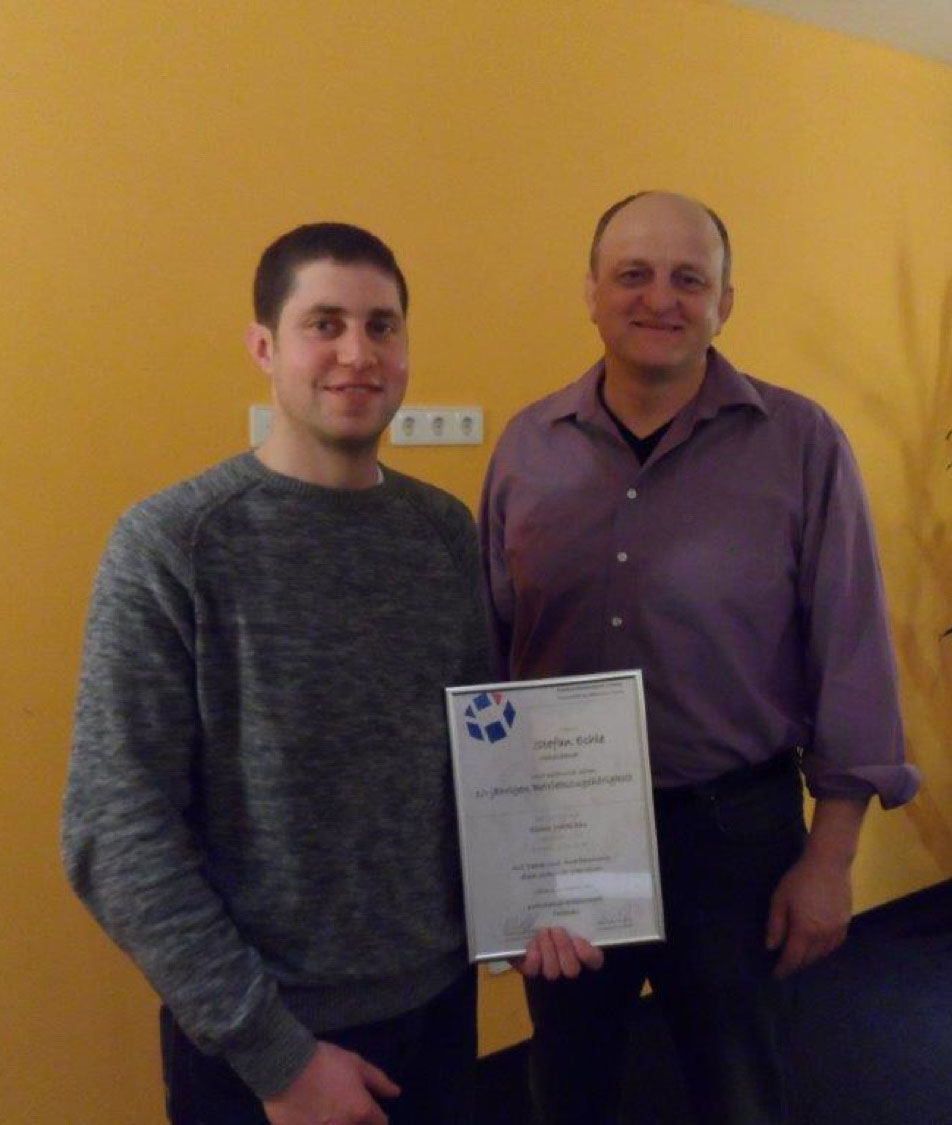 Bei Riehle Metallbau konnte Stefan Echle sein 10-jähriges Betriebsjubiläum feiern. Er absolvierte im Unternehmen seine Ausbildung zum Metallbauer. Firmenchef Xaver Riehle (rechts) dankte Stefan Echle für seine Mitarbeit und freut sich auf eine weitere gemeinsame Zukunft.