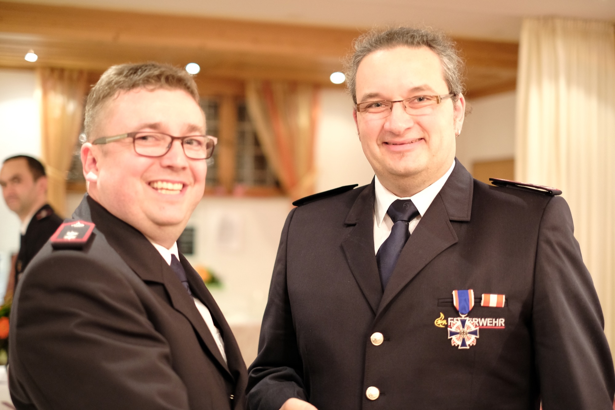 Daniel Erdrich wurde für seine Verdienste mit dem Deutschen Feuerwehr-Ehrenkreuz in Silber ausgezeichnet. Florian Lehmann hob noch einmal heraus, wie sehr er dessen Ehrlichkeit, Loyalität und Fähigkeit zum Unterscheiden von Wichtigem und Unwichtigem schätzt. Der Spagat zwischen seinen beiden Positionen als Abteilungskommandant und stellvertretender Kommandant sei nicht immer einfach gewesen und ihm doch gut gelungen, weil er das Gesamte immer gut im Blick behielt. »Großeinsätze sind meistens, wenn der Kommandant nicht da ist. Das war auch Dein Los der letzten zehn Jahre,« schloss Florian Lehmann seine Rede.
