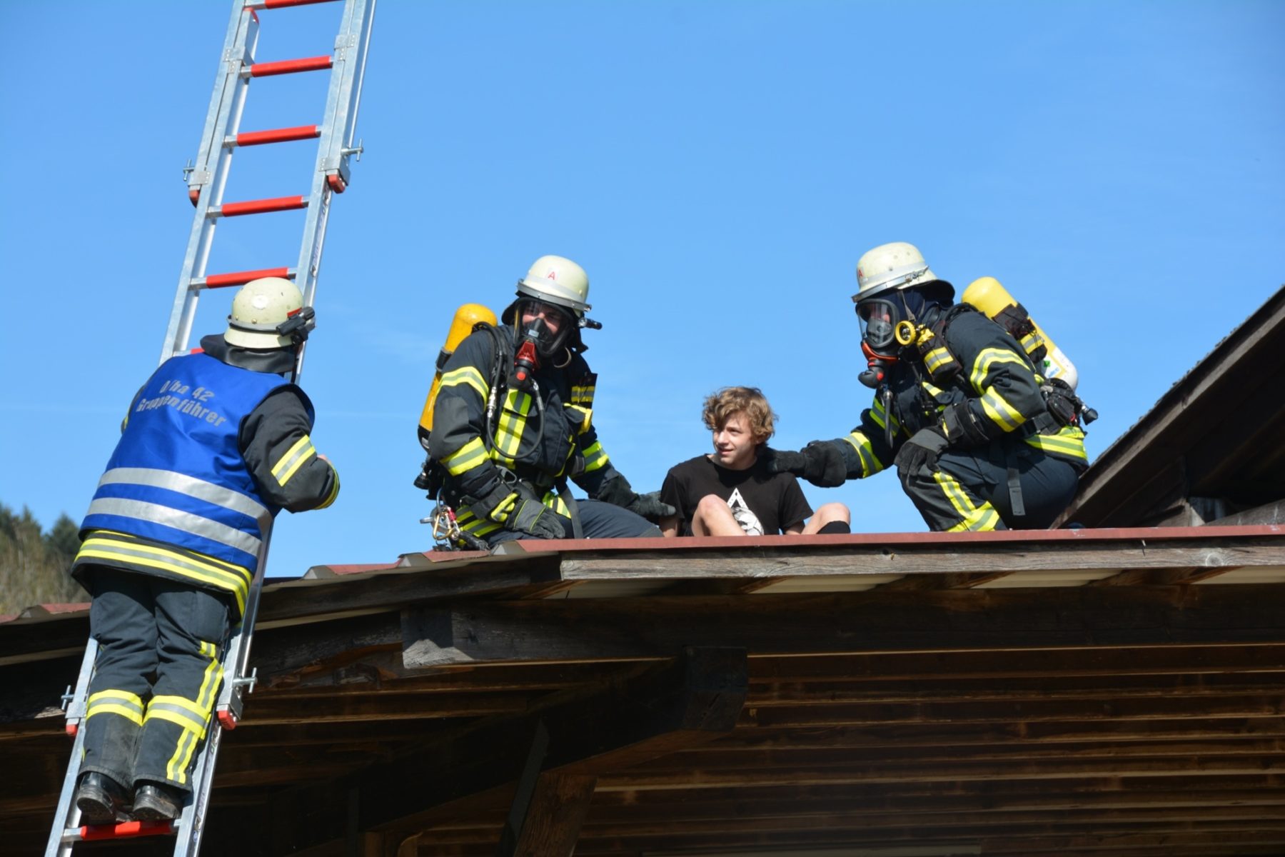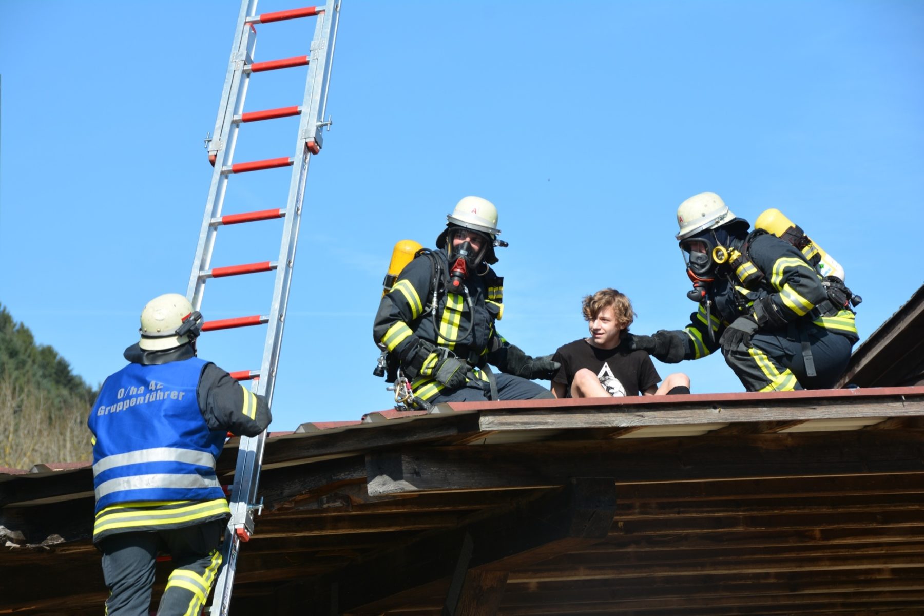 Menschenrettung und Brandbekämpfung lauten die Aufgaben für die heranrückenden Einsatzkräfte. Als erstes ist die Feuerwehr Unterharmersbach vor Ort und beginnt sofort damit, die verletzten Kinder zu suchen und diese aus dem Gefahrenbereich herauszubringen. Inzwischen ist auch die Nachbarwehr Oberharmersbach mit ihrem Löschgruppenfahrzeug am Einsatzort.