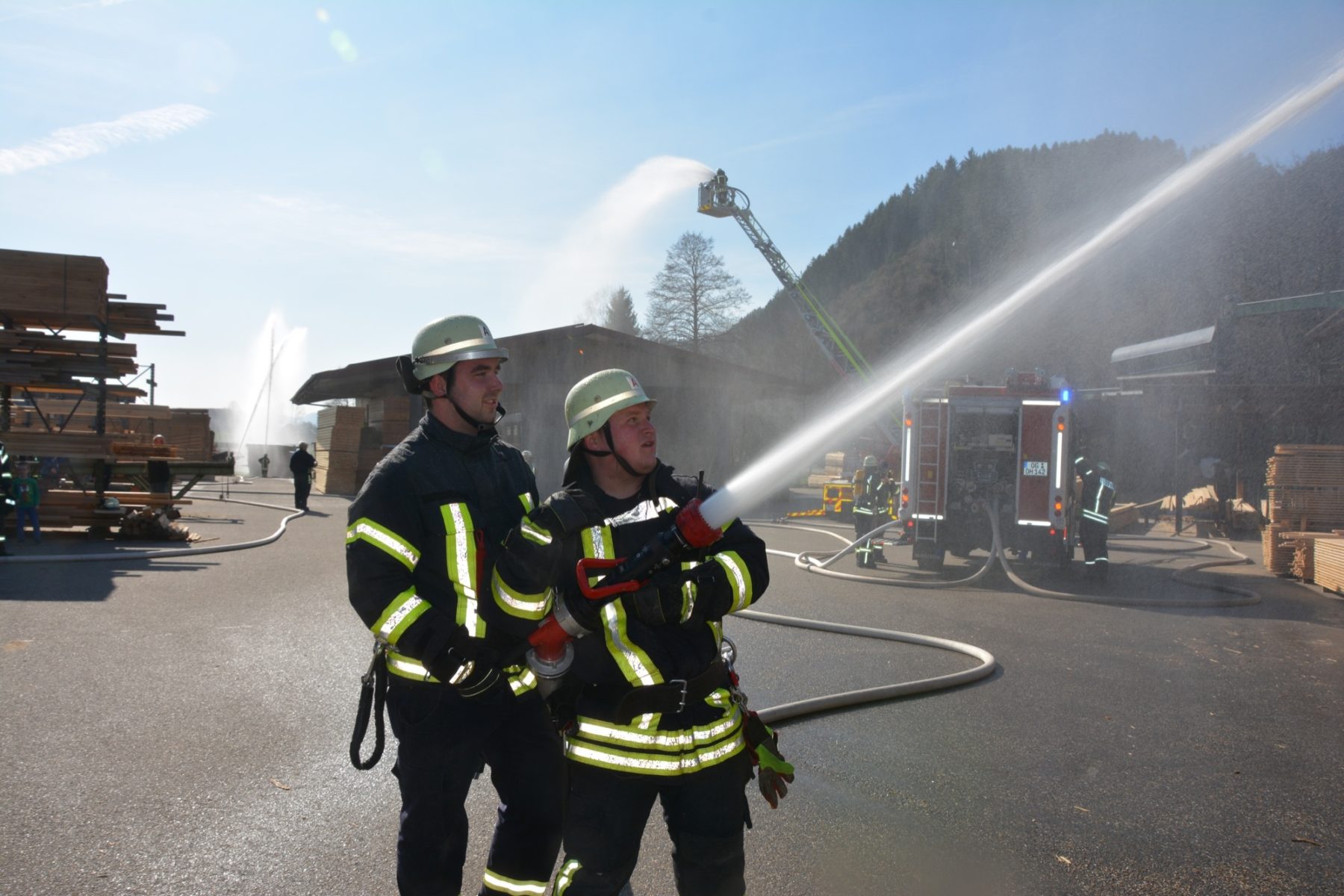 »Eine Schwierigkeit ist die beengte Zufahrt auf das Werksgelände«, informiert Gesamtkommandant Florian Lehmann über die Situation beim Sägewerk Burger. Die weiteren Einsatzfahrzeuge müssen zunächst wertvolle Zeit am Haltepunkt bei der Michaelskapelle verstreichen lassen, bis auch die Gengenbacher Drehleiter eingetroffen ist. Wären die anderen Fahrzeuge schon auf dem Gelände, könnte diese nicht mehr zum Einsatz kommen.