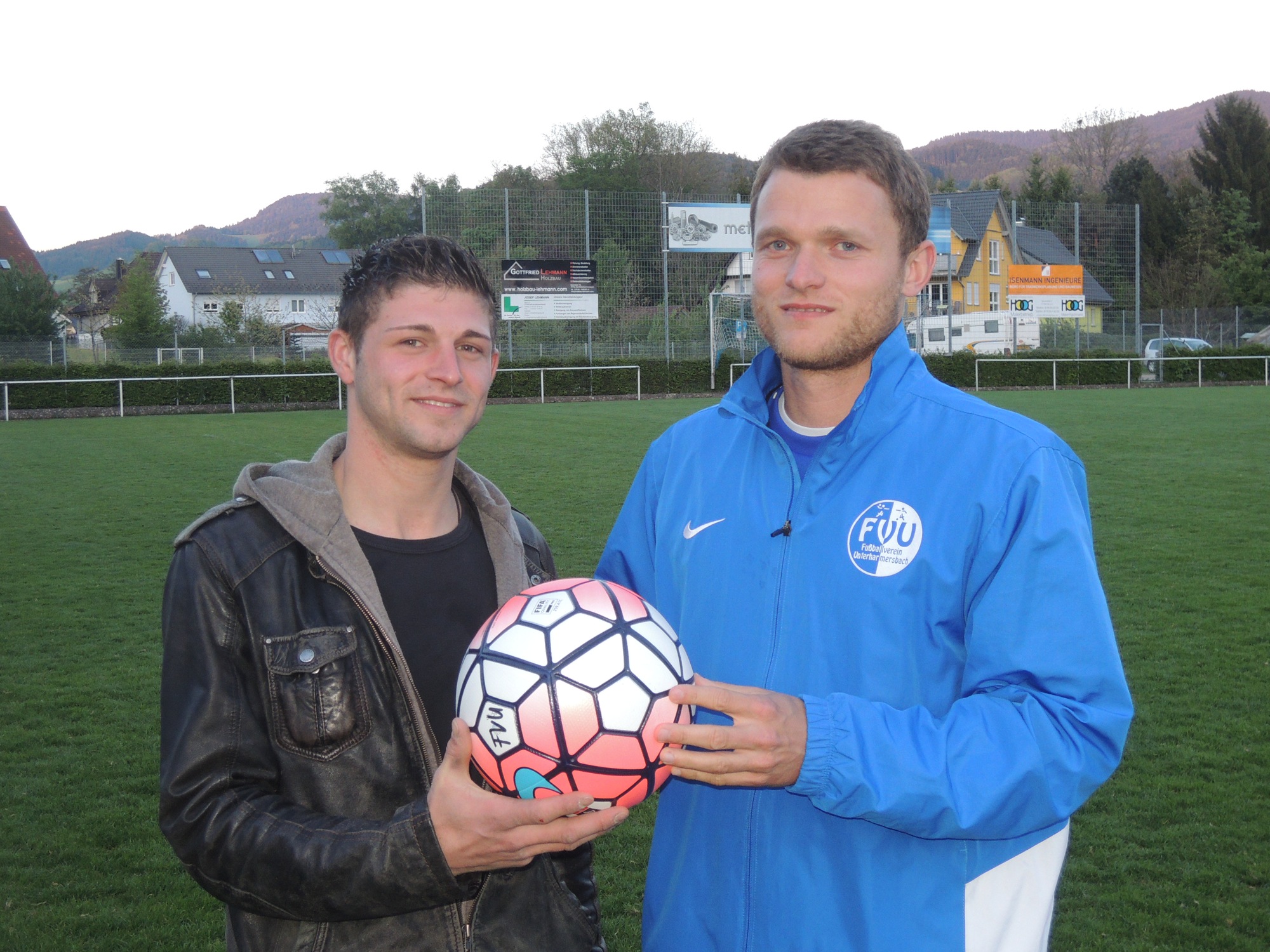 Die Familie Leisinger ist sehr aktiv beim FVU, der Papa Jörg ist im Spielausschuss des Vereins, Sohn Felix spielt in der 1. Mannschaft und Philipp wurde vom Vater überredet, einen Spielball zu spenden, was er sehr gerne macht. Dieser kommt nun beim Heimspiel des FV-Unterharmersbach gegen die U23 des SC Lahr zum Einsatz. Philipp Leisinger (links) ist von Beruf Fliesenleger und hat ein eigenes Geschäft und die Qualität der Arbeit ist hervorragend. FVU-Spieler Stefan Schwarz (rechts) nahm die Spende entgegen.