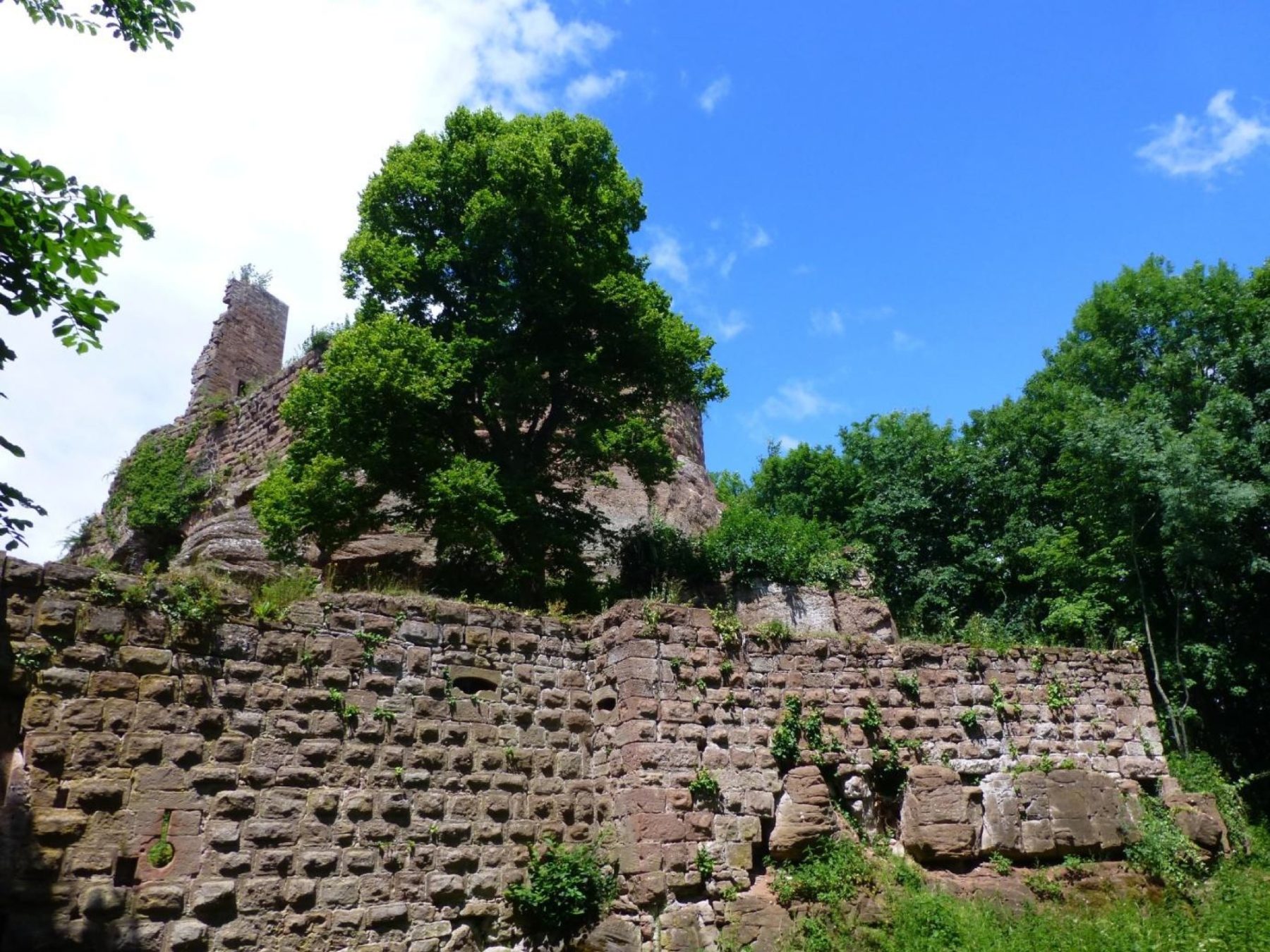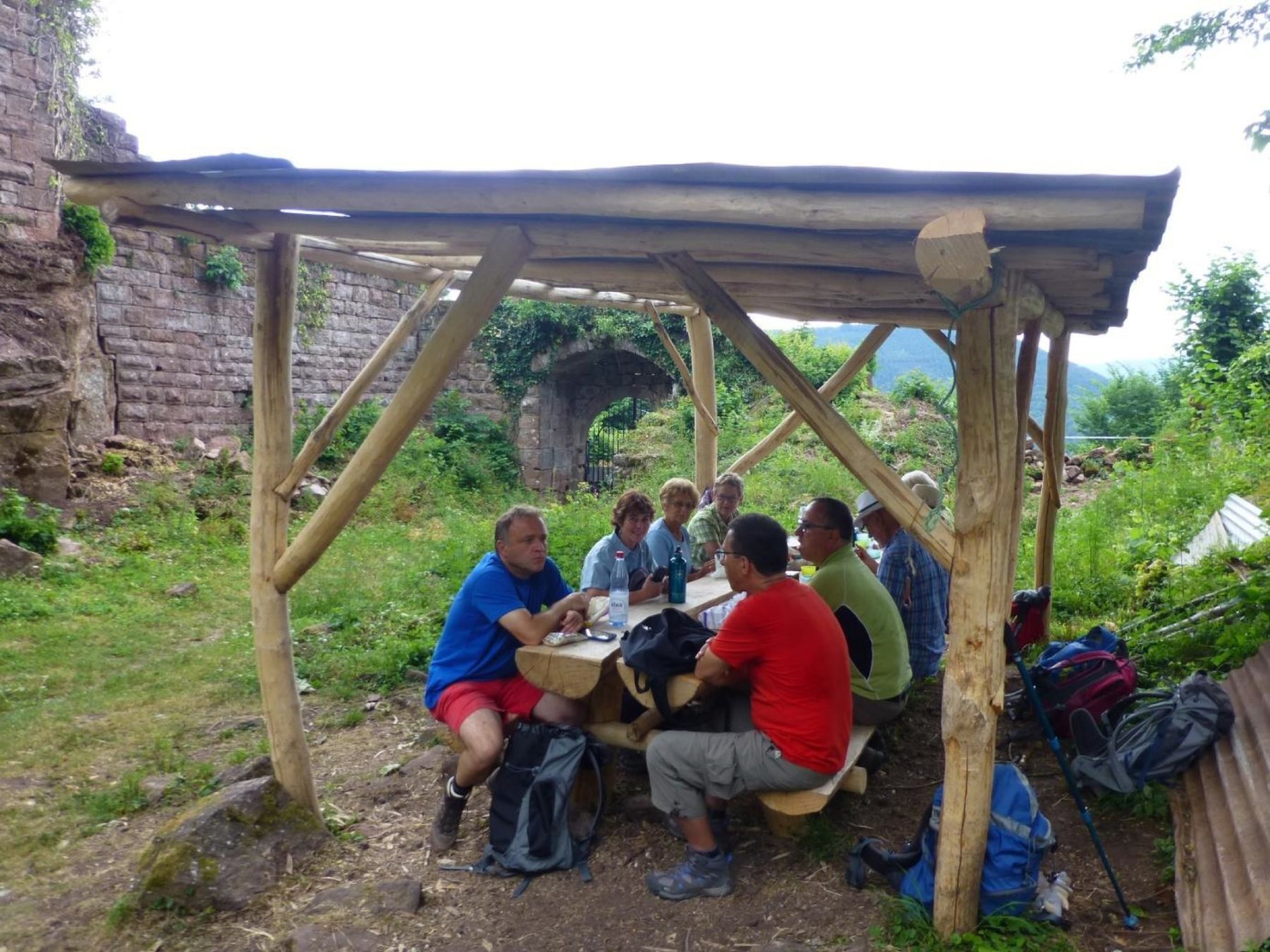 Bergauf ging es an einem verfallenen Forsthaus vorbei zum Château du Guirbaden, der größten Burganlage im Elsass. Dort wurde eine Pause eingelegt, um sich zu stärken. Nach der Besichtigung der Burganlage wanderte die Gruppe weiter Richtung Grendelbruch. Zwischendurch gab es herrliche Ausblicke ins Breuschtal und sogar bis zum Schwarzwald. Ein kurzer Abstecher führte zur idyllisch gelegenen Chapelle Sainte-Catherine. Kurz nach dem beschaulichen Ort Grendelbruch – mit seiner großen Kirche und dem schönen Rathaus – überquerten die Wanderer das Flüsschen Margel. Auf der anderen Talseite führte ein schmaler Pfad hinauf zum 570 Meter hohen Purpurkopf, welcher von den Kelten als Kultplatz genutzt wurde. Von hier war noch einmal die auf der anderen Talseite liegende Burgruine »Guirbaden« zu sehen. Bergab ging es zurück zum Ausgangspunkt, dem Wanderparkplatz »Fischhütte«.
