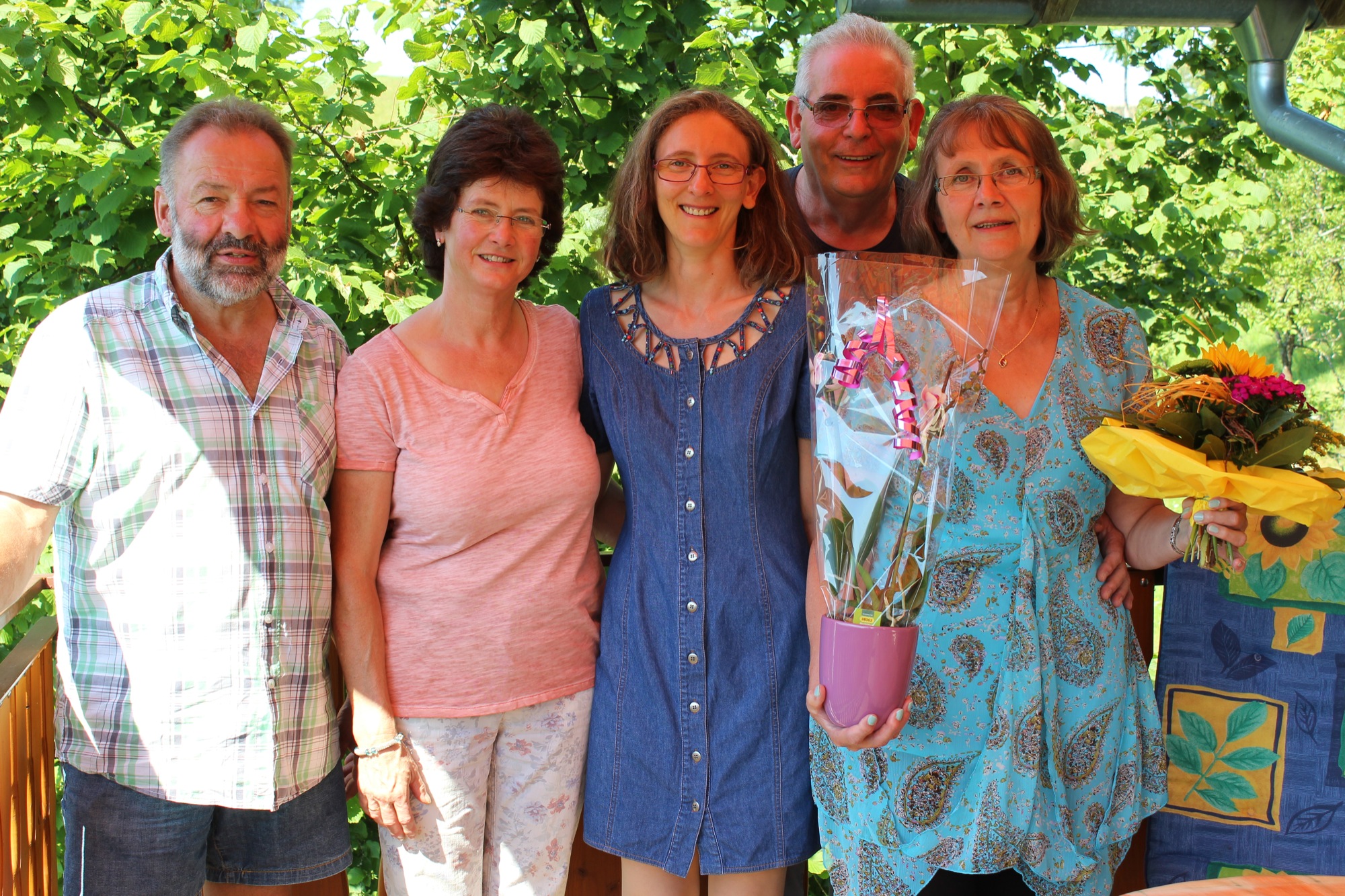 Alain und Raymonde Burel aus Lothringen kommen seit 15 Jahren mehrmals im Jahr ins »Haus Eck« zu Familie Braun (links). Manchmal haben sie noch die Enkel oder Kinder dabei. Dieses Mal ist Tochter Rahel mitgekommen. Familie Burel (rechts) unternimmt immer viele Fahrten in die Umgebung, genießt aber auch die wunderschöne Landschaft und das herrliche Panorama auf der Terrasse vom Ferienhaus Eck.