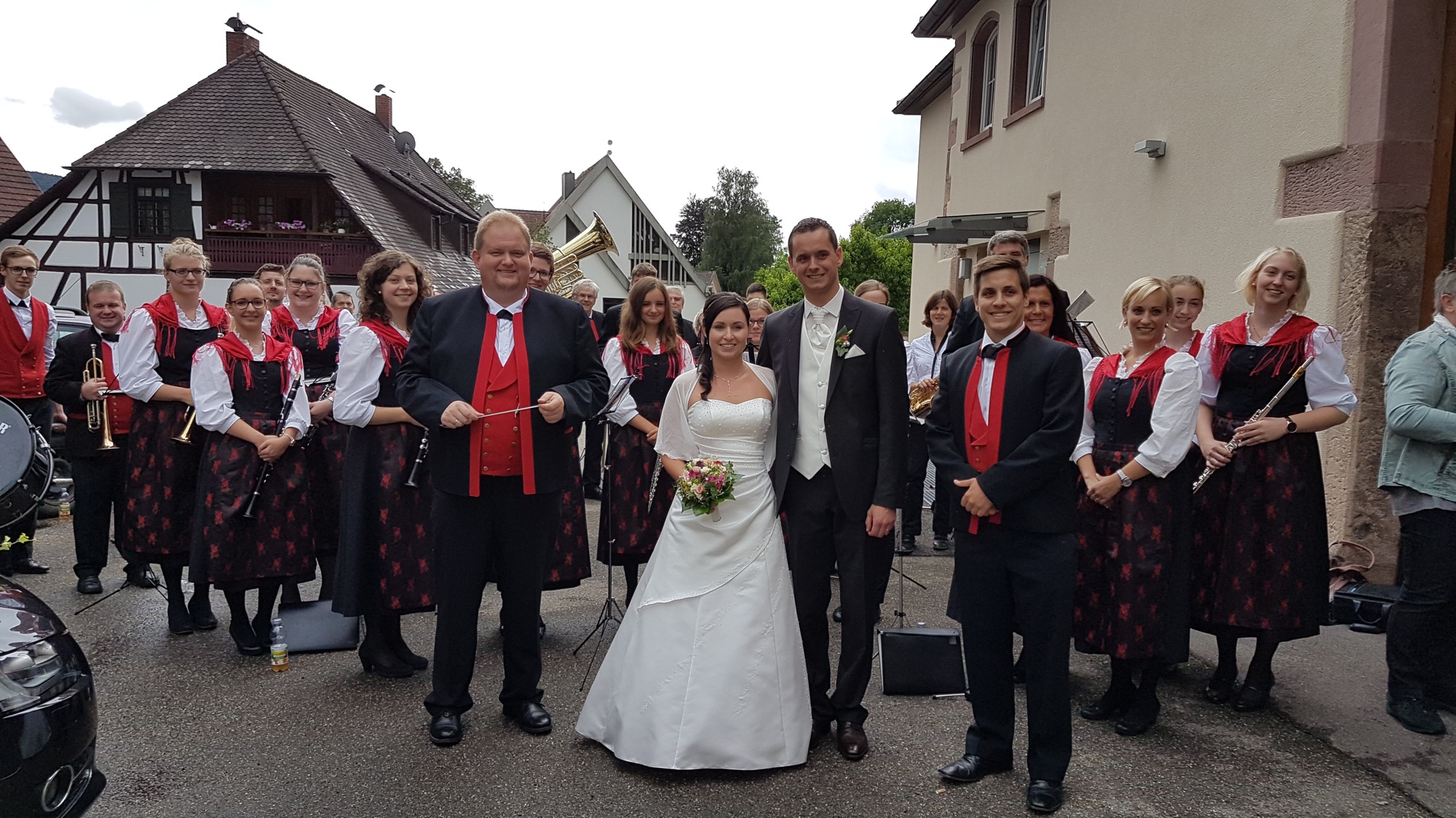 Im Anschluss gab der Musikverein Unterharmersbach noch ein kleines »Ständerli«, während die zahlreichen Gäste dem Brautpaar ihre Glückwünsche überbrachten und beim Sektempfang mit ihnen auf die Zukunft anstießen. »Liebe Jenny und lieber Christian, wir wünschen euch nur das Beste für eure gemeinsame Zukunft«, überbrachte zweiter Vorsitzender Steffen Stehle im Namen des Vereins die Wünsche. Diesen möchte sich die Lokalzeitung »Schwarzwälder Post« anschließen und wünscht dem Paar alles Gute.