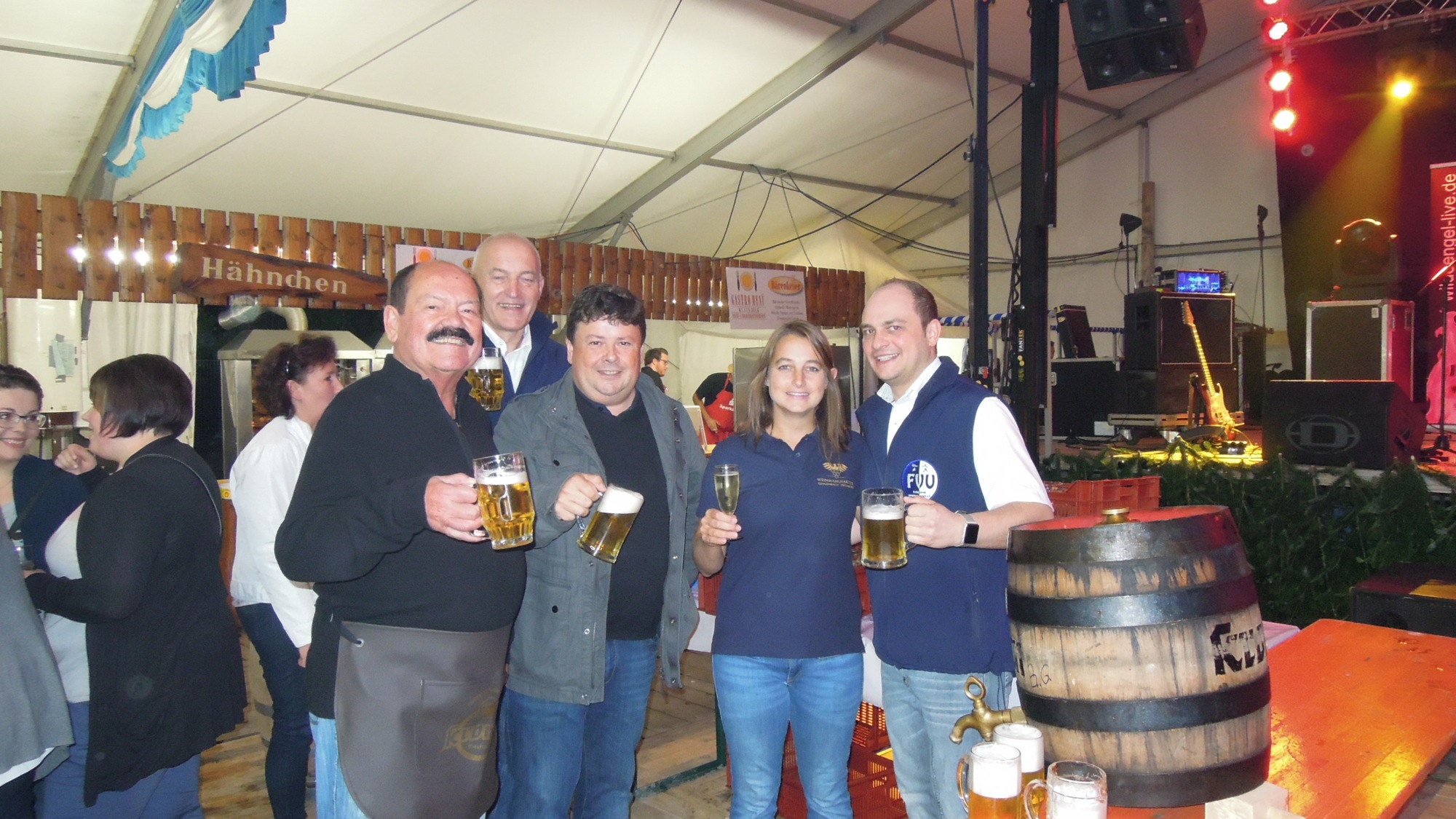 Foto: Hans-Peter WagnerNach eher mäßigen Kilwi-Eröffnungsabenden in der Vergangenheit hatte der FV Unterharmersbach dieses Jahr mit der Verpflichtung der Coverband »Wilde Engel« aus dem Hochschwarzwald einen Volltreffer gelandet. Die siebenköpfige Erfolgstruppe mit ihrem »Oberengel« Sebastian Steinhart machte ihrem Ruf als Partybombe alle Ehre. Mit ihrem vierstündigen Non-Stop-Programm brachten die Wilden Engel die Stimmung zum Überschäumen. Gegen Mitternacht gab es im vollbesetzten Festzelt keinen mehr, der nicht mittanzte, mitschunkelte oder mitklatschte. Spätestens bei »Skandal um Rosi« brach ein regelrechter Partysturm los. Viele standen auf den Bänken, auf den Tischen oder hatten in der dichtgedrängten Menge rund um die Bühne ein Plätzchen ergattert. Selbst Ortsvorsteher Hans-Peter Wagner hielt es nicht mehr auf seinem Platz. Als Ehrenvorsitzender inmitten seiner FVU-Fußballer ging auch für ihn die Post ab.