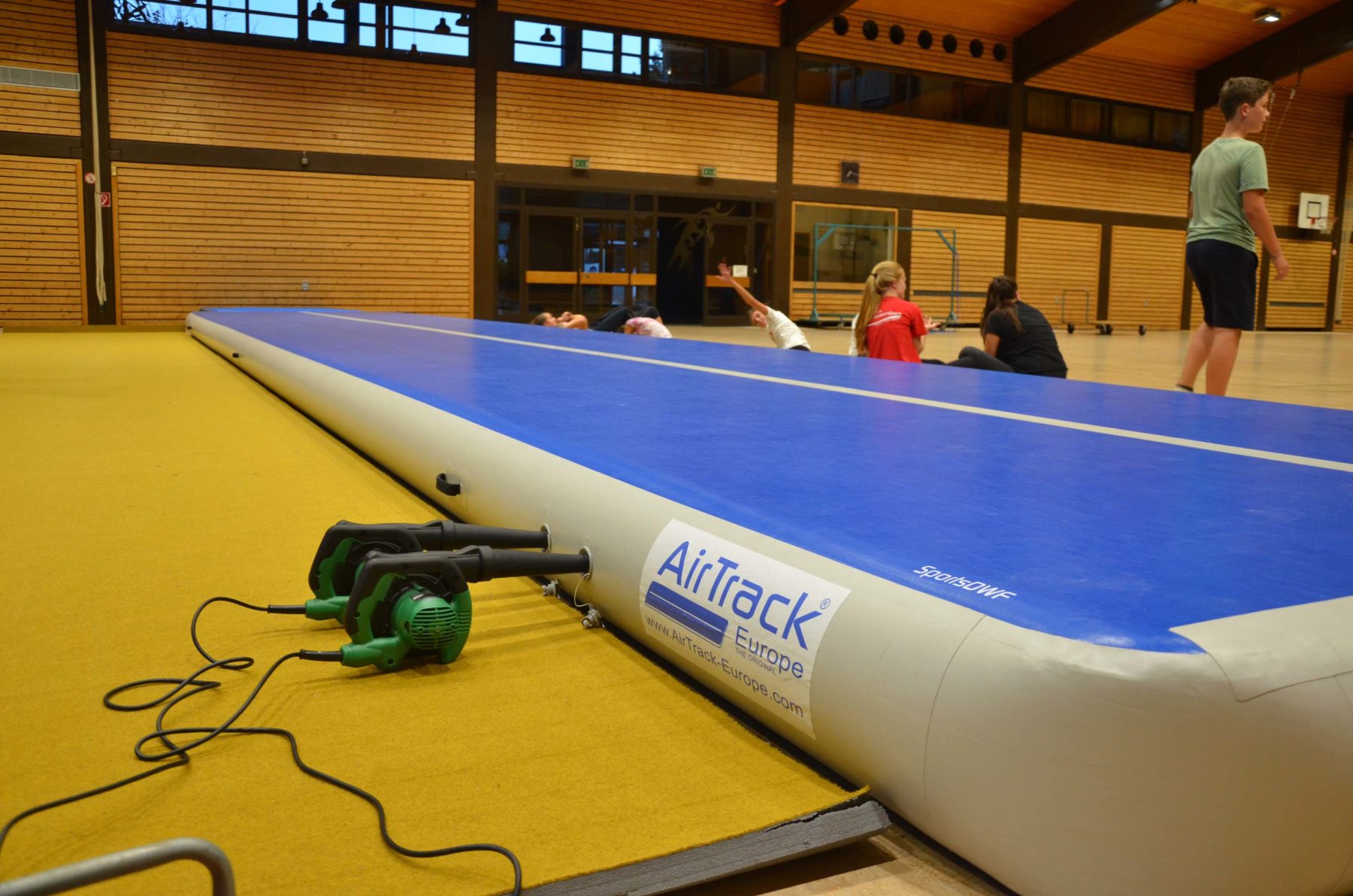 Eine Air-Track-Sprung-Bahn ist ein luftgefülltes Kissen und erinnert auf den ersten Blick an eine lange Hüpfburg. Sie ist knapp drei Meter breit und 15 Meter lang. In zehn Minuten blasen zwei Hochleistungsgebläse das Luftkissen auf.