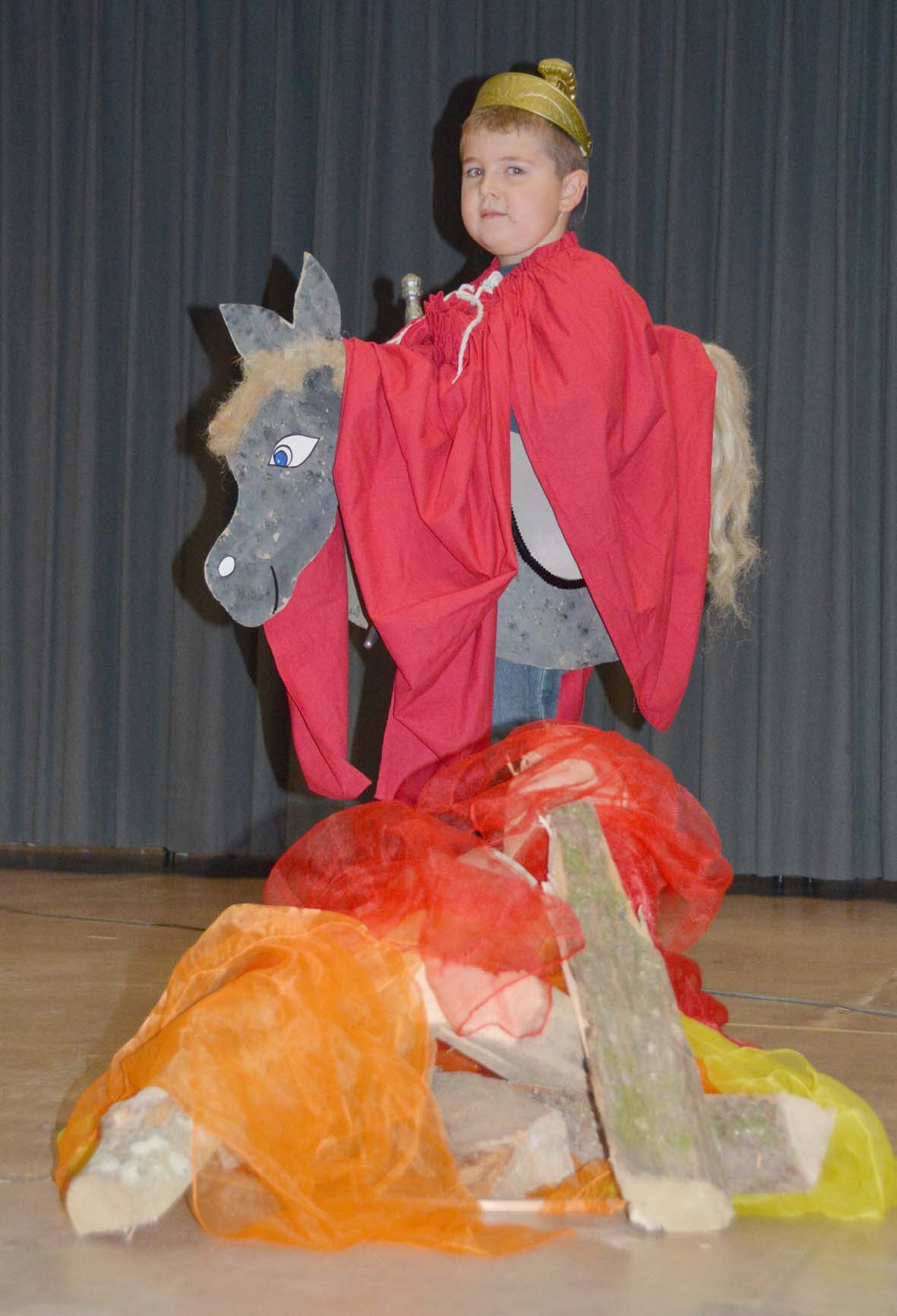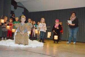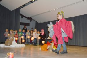 Das Rollenspiel, die Tänze und die gemeinsam gesungenen Lieder ergänzten sich zu einem schönen Martinsspiel. In den Hauptrollen spielten sehr gekonnt Marlon Ernst (St. Martin), Noah Müller (Bettler), Kim Brosemer (Bär) und Prya Schmidt (Mädchen Marina).