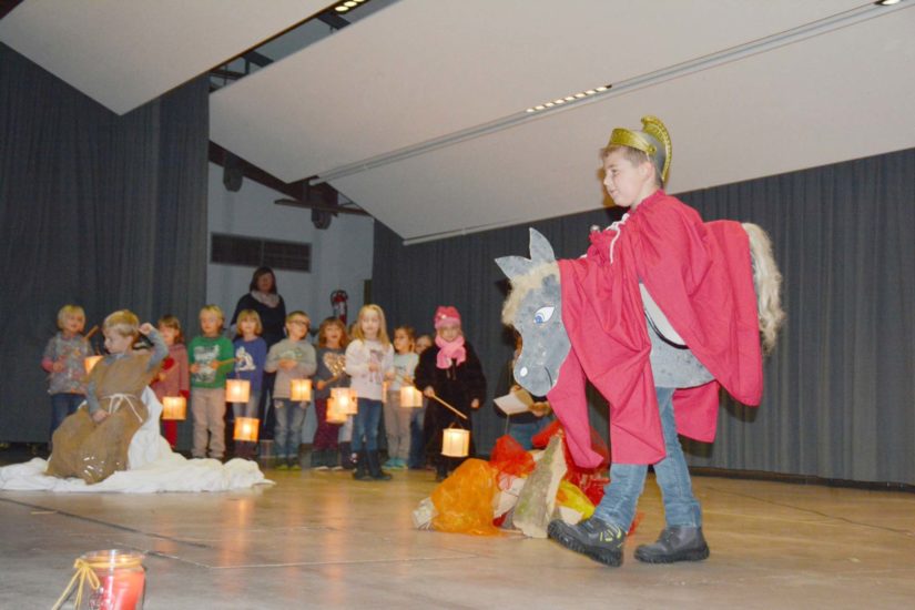 Wegen des schlechten Wetters musste der Kindergarten »Kleine Wolke« die Martinsfeier in die Schwarzwaldhalle verlegen. Dies hatte den Vorteil, dass das stimmungsvolle Martinsspiel der Schulanfänger auf der Bühne auch sehr gut zur Geltung kam.