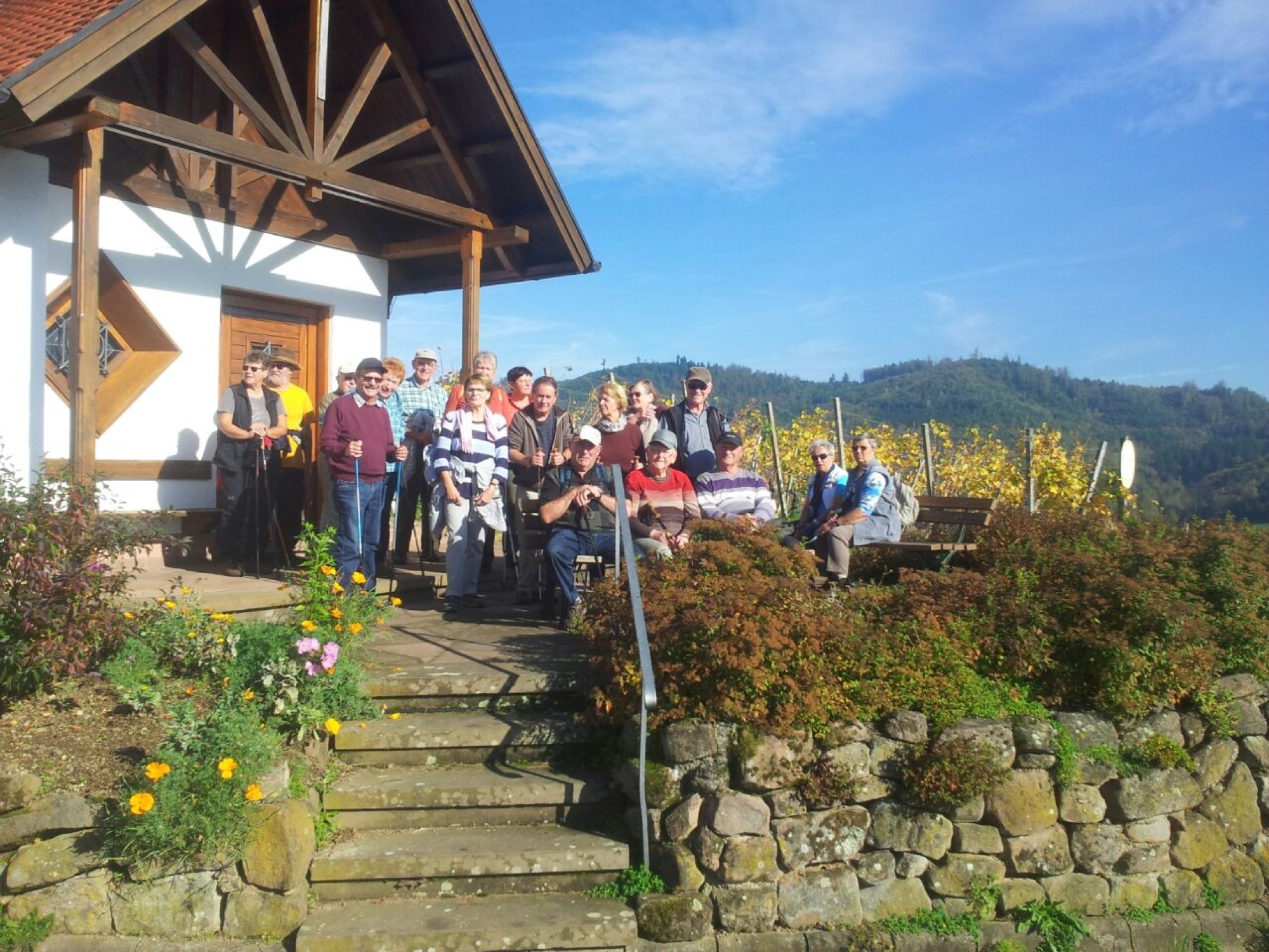 In der kleinen Kapelle »Maria im Weinberg« auf der Höhe angekommen, fand man eine kurze Zeit der Ruhe nach dem Aufstieg. Mit einem herrlichen Ausblick weit über Offenburg hinaus und inmitten der Reben wurde die muntere Gruppe belohnt. Dabei wurden bei Mundharmonika-Begleitung einige Lieder angestimmt.