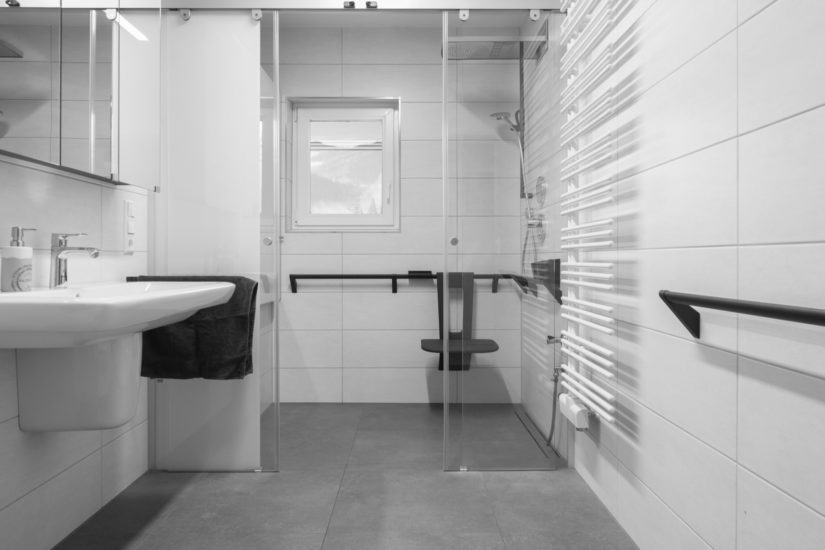 Eine bodengleiche Dusche ist eine wichtige und die wohl beliebteste Maßnahme, um Hindernisse im Badezimmer von vornherein zu minimieren. Für Senioren sind auch Duschtassen mit geringer Schwelle hilfreiche Einbauten. Rutschhemmende Auflagen oder Fliesen bieten im Duschbereich einen sicheren Stand. Langes Stehen ist für körperlich beeinträchtigte Personen meist anstrengend. Ein Klappsitz macht das Duschen komfortabler und kann bei Nichtgebrauch platzsparend eingeklappt werden. An der Wand befestigte Handläufe geben dem Duschenden Halt.