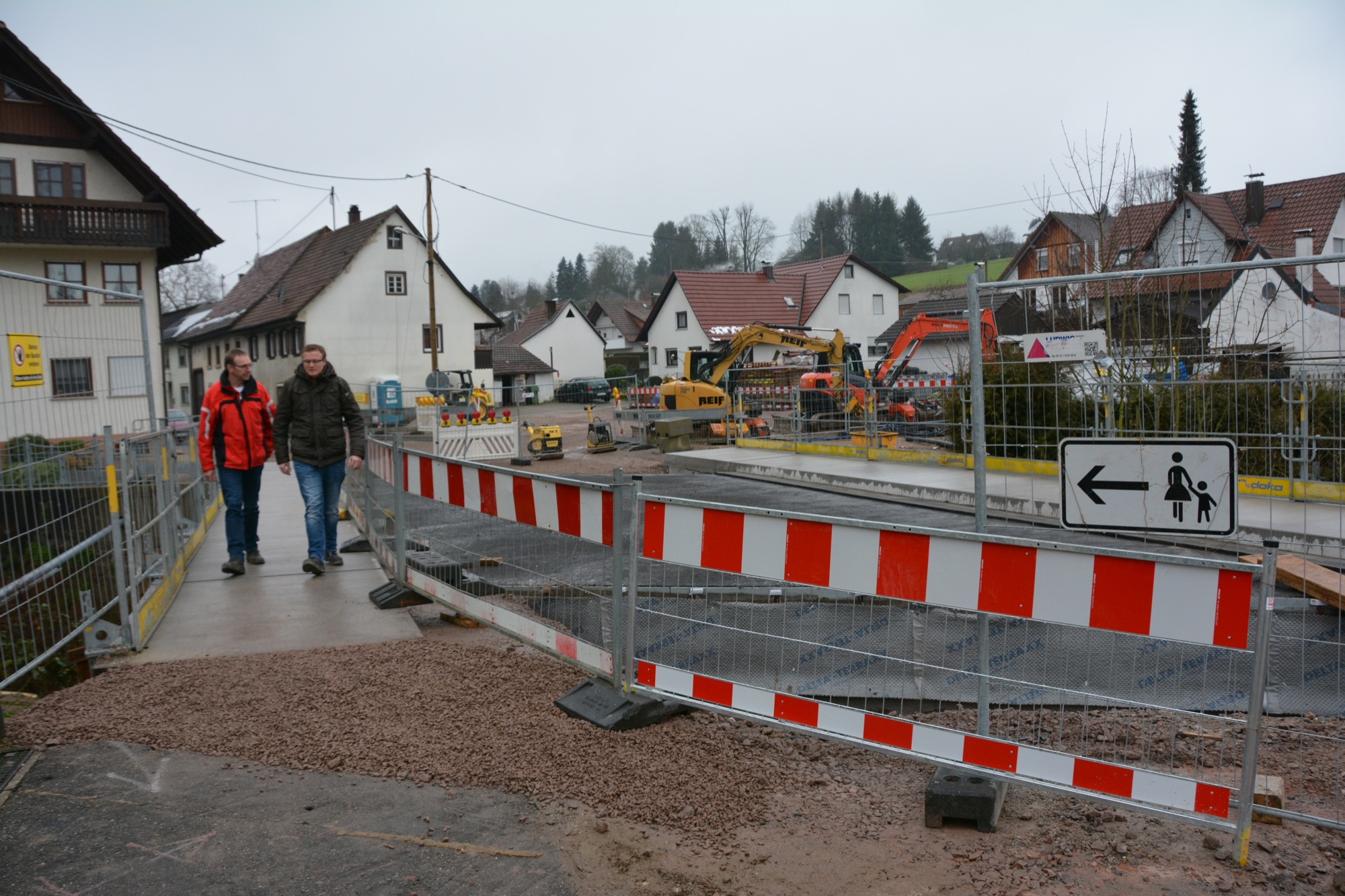 Der Weg für Fußgänger ist entlang der Hauptstraße wieder frei. Über die Kaffeebrücke konnte rechtzeitig vor Weihnachten am Montag der Fußgängerweg freigegeben werden. Vor Ort waren auch Projektleiter Andreas Maier (rechts) und Bauaufseher Richard Wurth (links) vom Baureferat Nord des Regierungspräsidiums Freiburg, um sich vom Baufortschritt zu überzeugen. »Wir hatten Glück mit dem Wetter«, blickt Projektleiter Maier auf die letzten Monate zurück, so dass die Baumaßnahmen, insbesondere die notwendigen Abdichtungsmaßnahmen planmäßig durchgeführt werden konnten. Der »Sonderweg Fußgänger« ist mit einem provisorischen Geländer gesichert. Wenn nach dem Jahreswechsel die Brückenbauarbeiten in die Endphase gehen, muss der Fußgängerüberweg dann nochmals geschlossen werden. Bis dahin können die Unterharmersbacher die kurzen Wege genießen und sich ein Bild von der Sanierung der Ortsdurchfahrt machen.