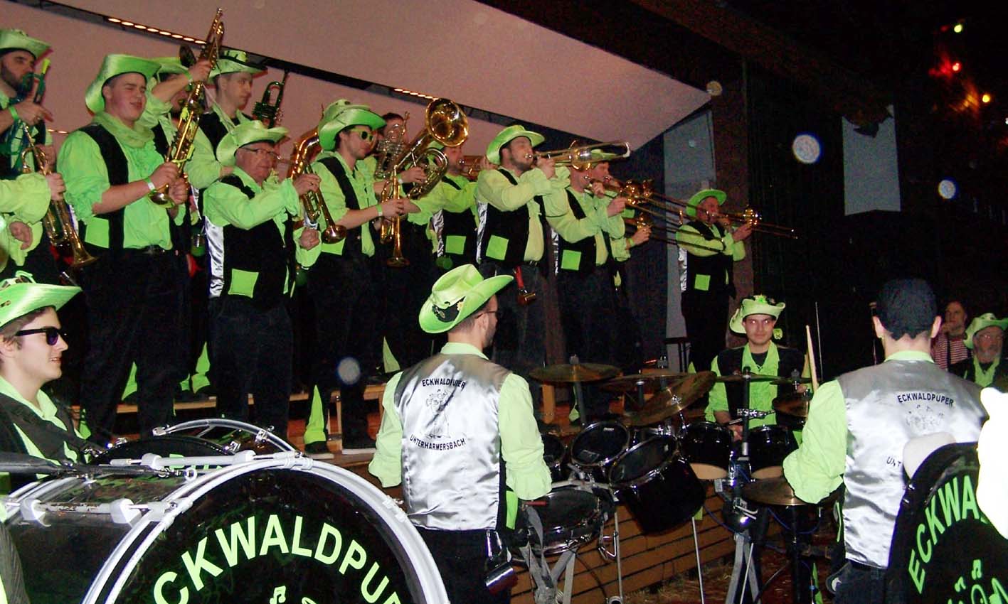 Nach diesem starken Auftritt war der Boden für die heimischen Eckwaldpuper bestens bestellt. Mit ihrer seit vielen Jahren bewährten Erfahrung nahmen sie die ausgelassene Stimmung mit und heizten dem närrischen Partyvolk noch einmal richtig ein. Dominante Rhythmuswechsel zogen sich durch das gesamte Repertoire und setzten immer wieder markante Höhepunkte – so dass die Schwarzwaldhalle punktgenau zum Klassiker »die ganze Halle hüpft« von einem gewaltigen Beben erfasst wurde, das man auch in der benachbarten Fasendshochburg Zell noch gepürt haben dürfte.