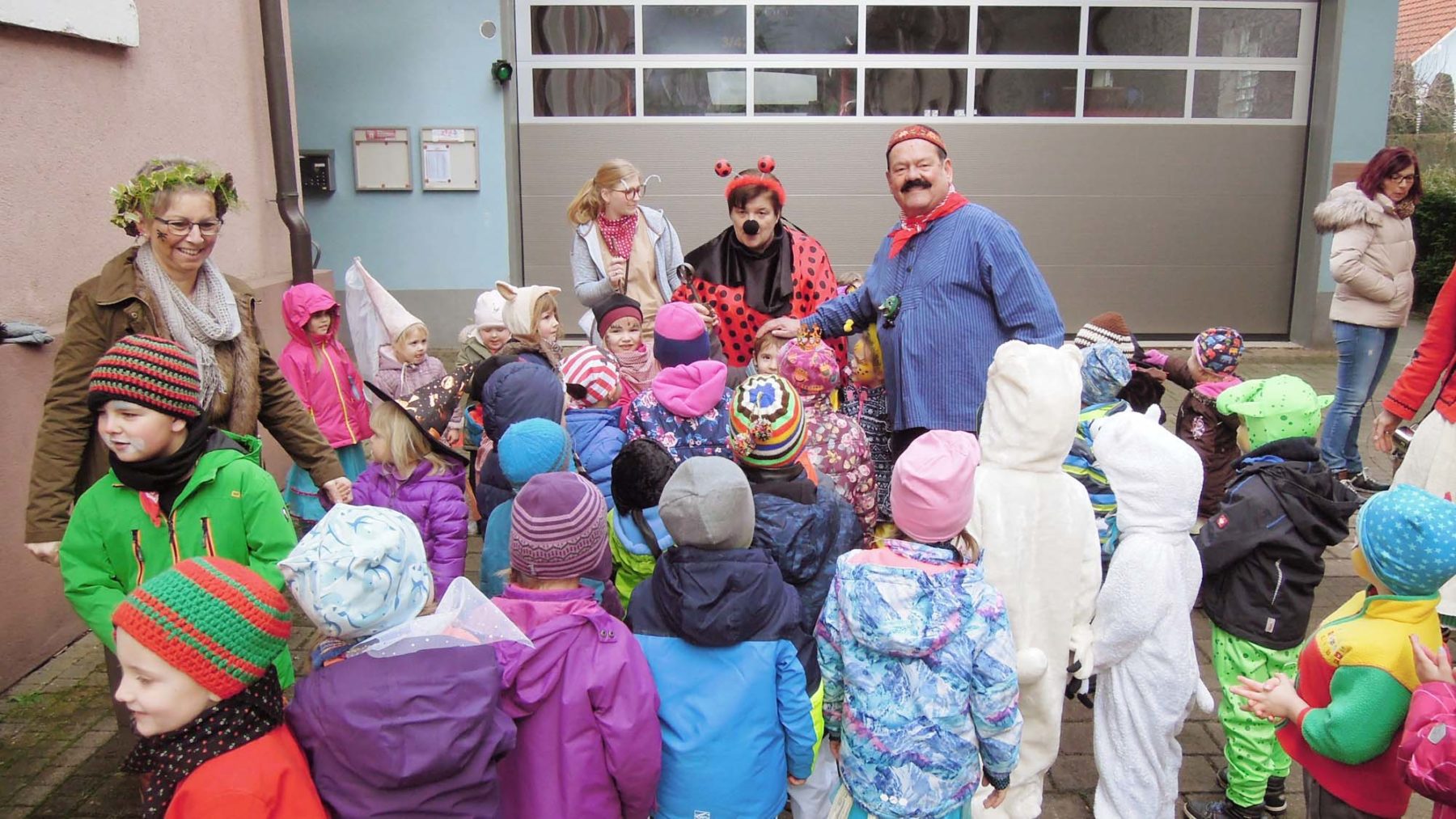 Den Beginn machten traditionell die Kindergartenkinder, die mit ihrer Leiterin Barbara Schmid und den Erzieherinnen singend und tanzend zum Rathausplatz zogen und dort in der Feuerwehreinfahrt ein vom Arbeitstrubel geschütztes Plätzchen fanden. Mamas von den Eckwaldhexen waren ebenfalls mit Eifer und ohne Maske dabei und schlossen mit den Kindern schnell Freundschaft.