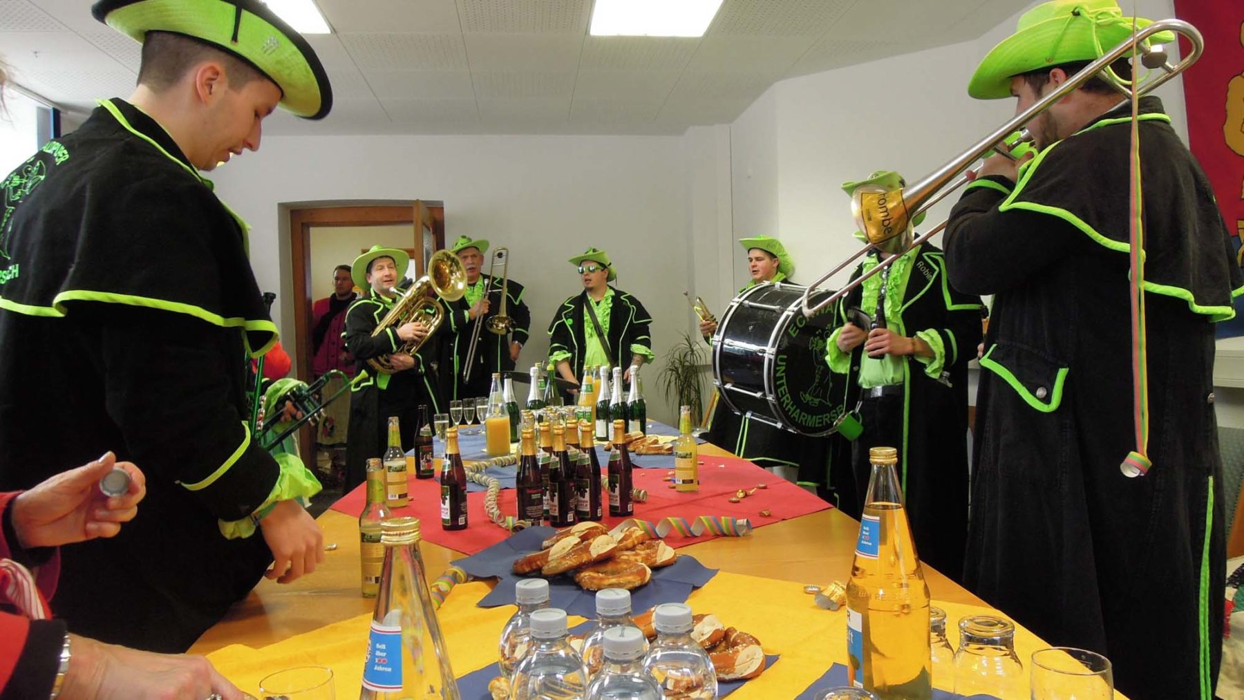 Nach den Kindergartenkindern machten Eckwaldhexen und Guggenmusik dem Rat­hauschef ihre Aufwartung, Sie wurden in den neuen Multifunktions-Saal im Erdgeschoss des Rathauses eingeladen. In seiner Begrüßung betonte der Ortsvorsteher, dass der neue Saal in der ehemaligen Post als Sitzungszimmer und zeitweiliger Hexenkeller ähnliche Funktionen habe, bei denen es ähnlich laut und öfters närrisch zuging.