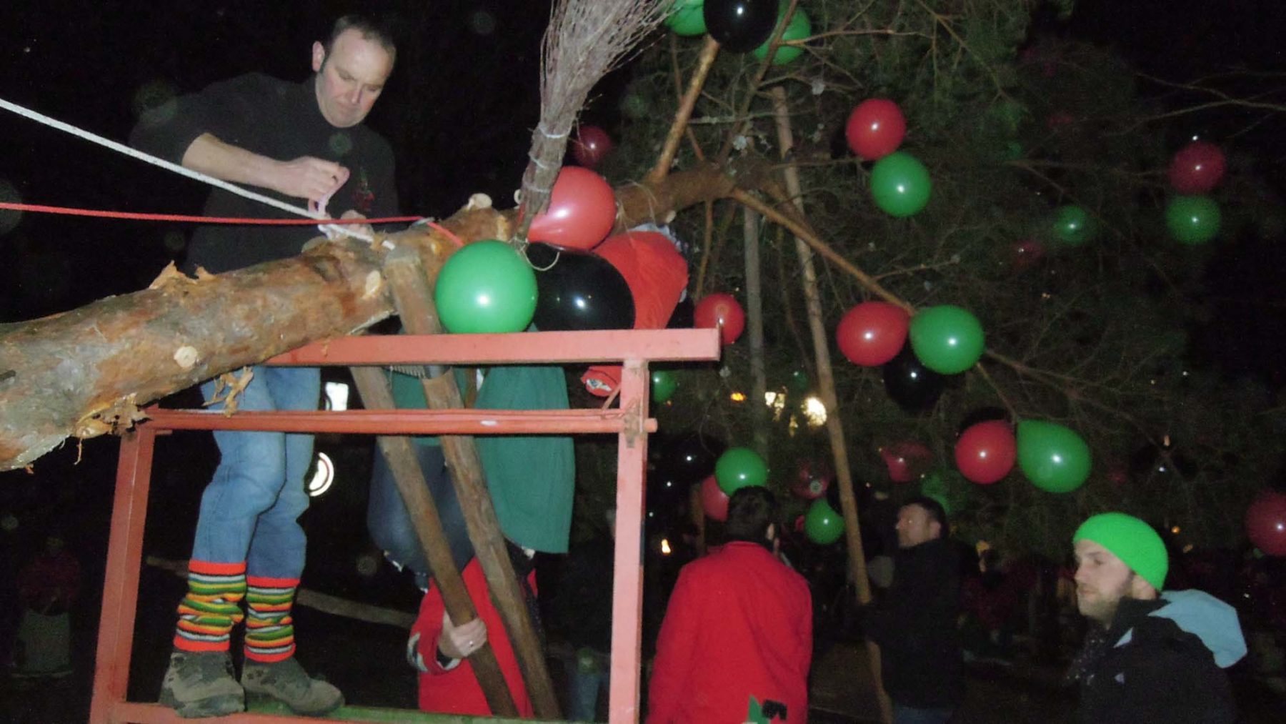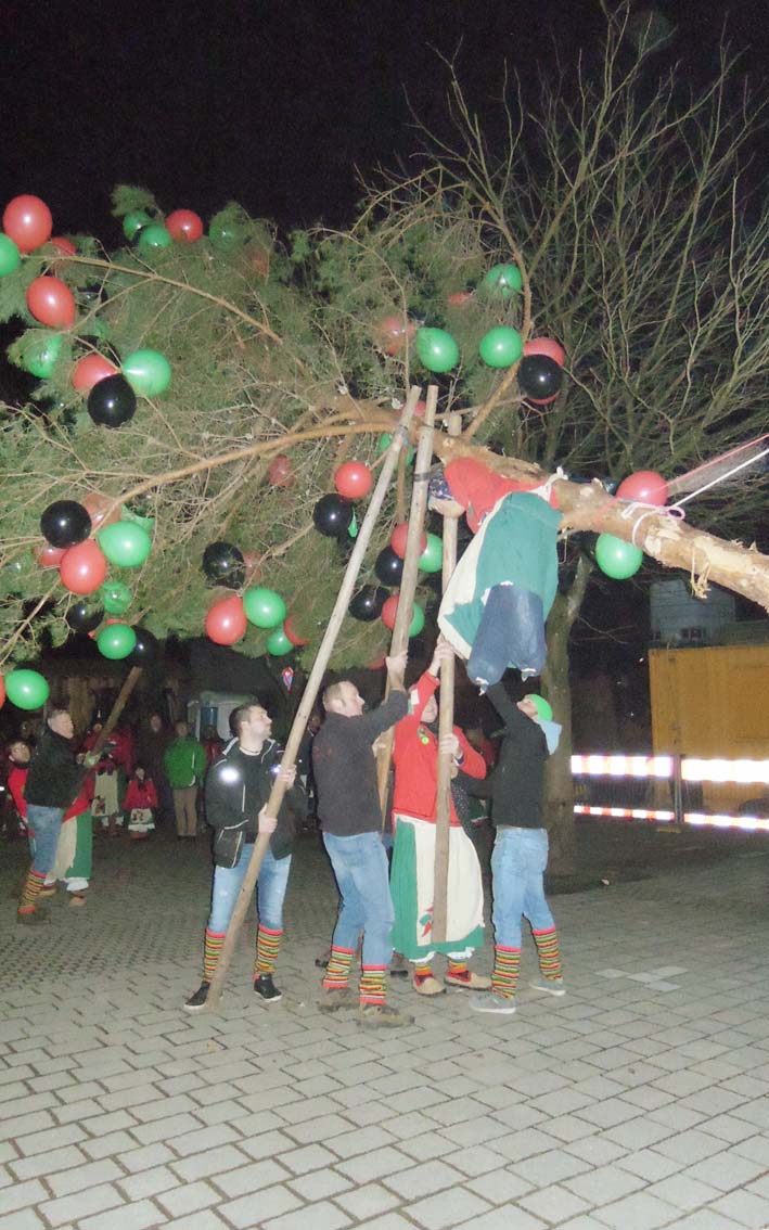 Johannes Schwarz mit seinem eingespielten Team stellten in Rekordzeit den Narrenbaum auf.