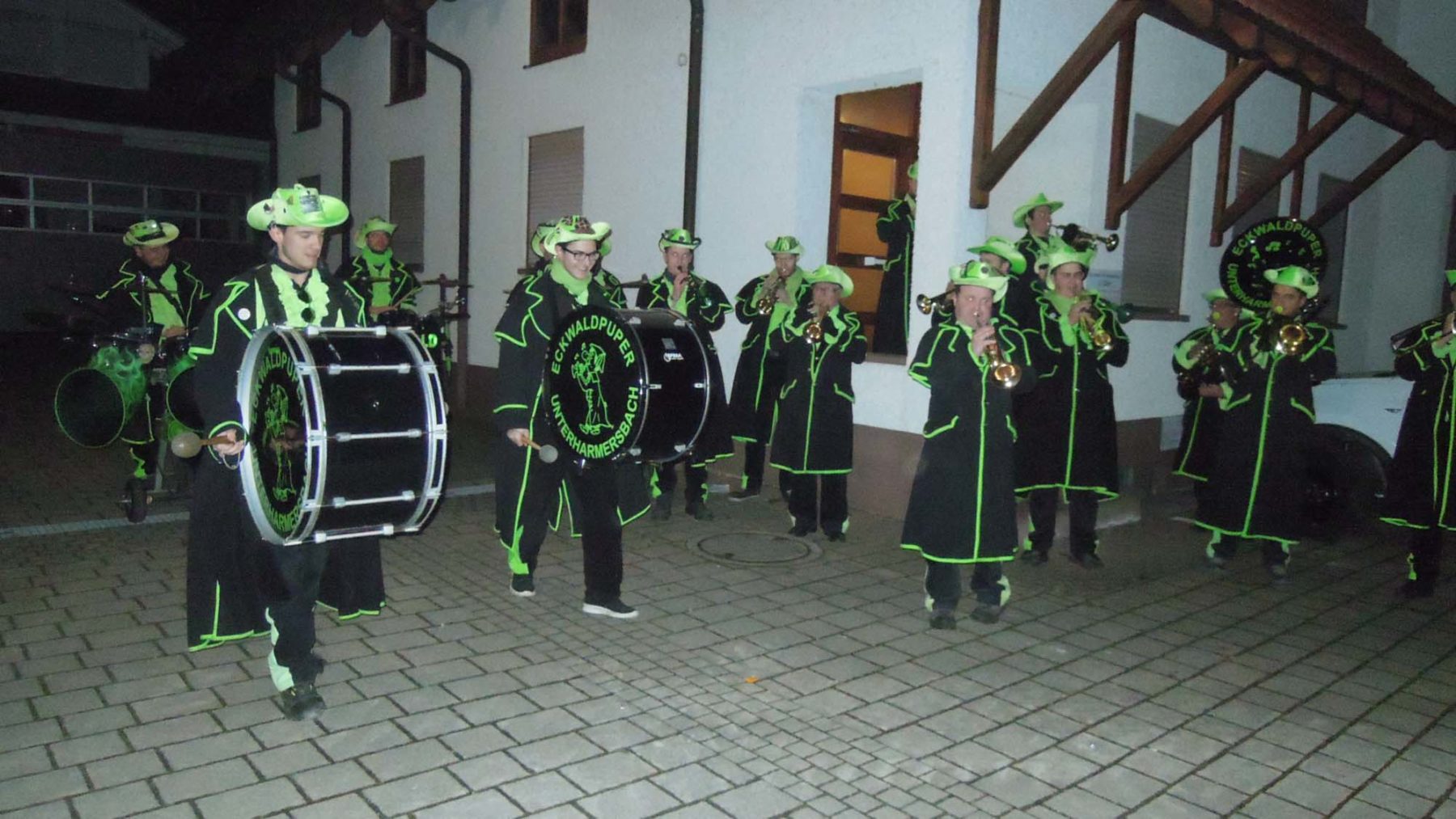 Die Ankündigung des Ortsvorstehers, dass nun das Bu­ffet mit jeder Menge flüssiger und fester Nahrung zur Stärkung für die närrischen Tage eröffnet sei, wurde mit Riesenbeifall und den Rufen »Eckwaldhexen« und »Narri Narro« bedacht. Danach zogen die Eckwaldpuper alle Register und der Fasentbeginn wurde kräftig gefeiert.