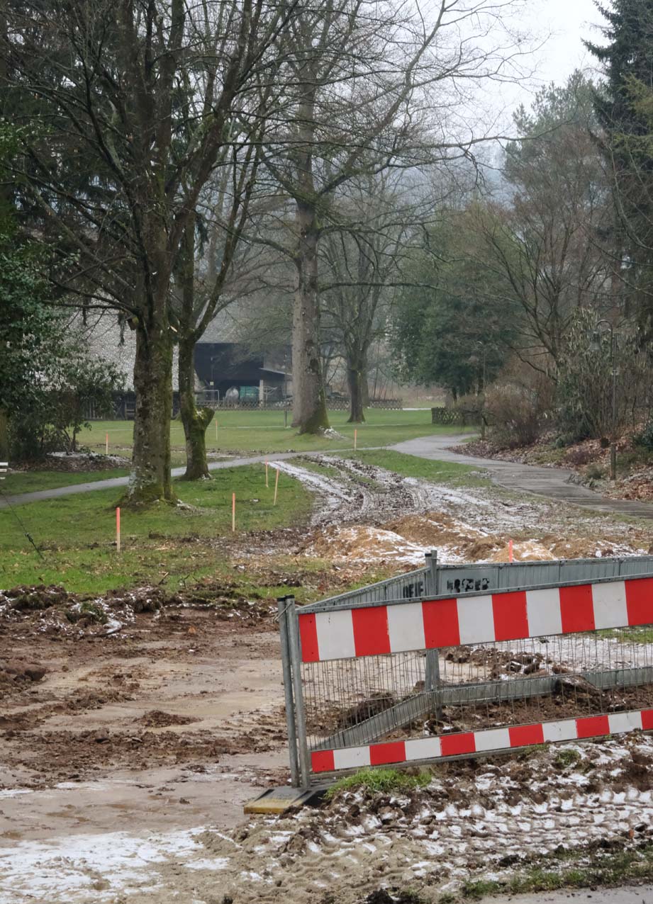 Auch wenn im Kurpark schon die Trasse für die Umleitung abgesteckt ist: Die Bauarbeiten an der Rösslebrücke, deren Bauherr das Regierungspräsidium ist, beginnen erst im Herbst. Als vorbereitende Maßnahme wurden im Winter bereits Bäume gefällt.