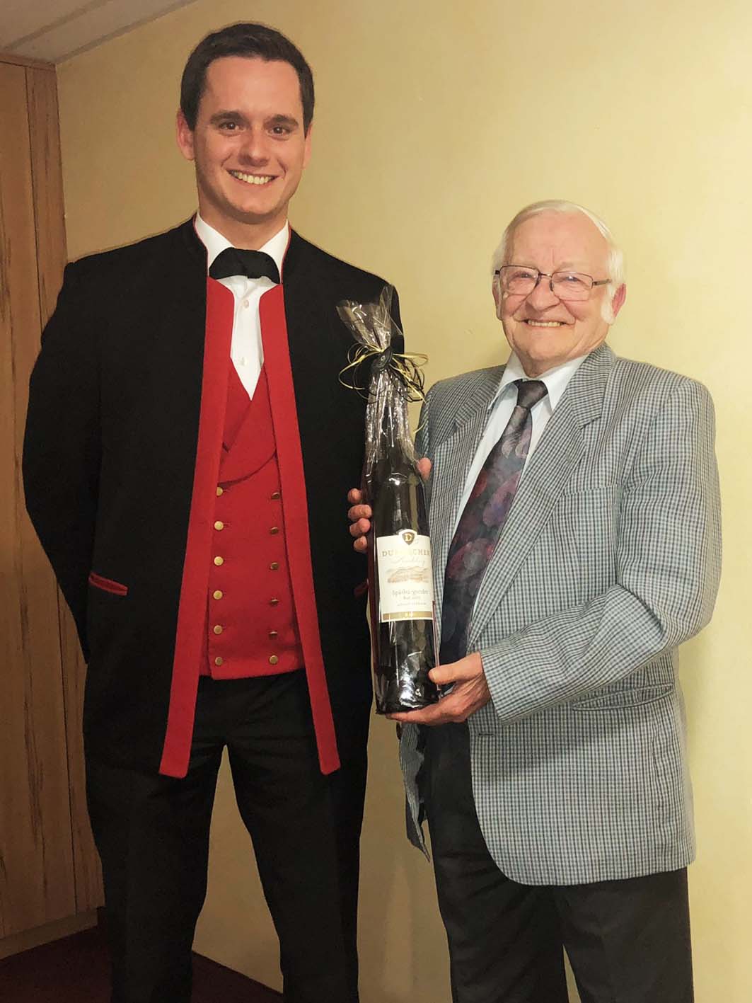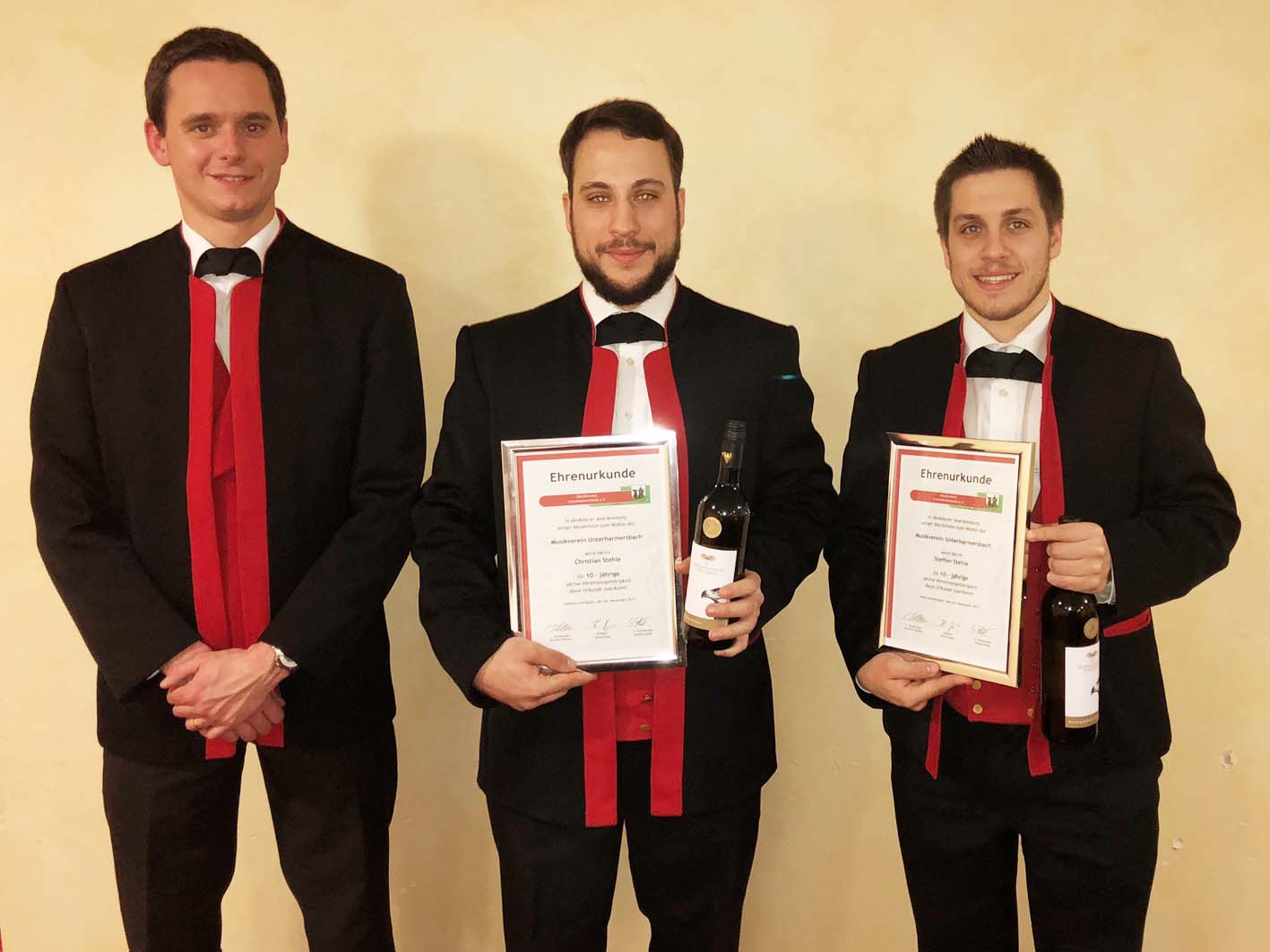 Foto: Hans-Peter WagnerFür zehn Jahre aktive Mitgliedschaft wurden Christian und Steffen Stehle geehrt. Beide spielen Tenorhorn und gehören zu den besten Probenbesuchern. In der Verwaltung arbeiten sie beide mit hohem Engagement mit. Steffen Stehle ist 2. Vorsitzender, Christian Stehle ist Fachbereichsleiter Veranstaltungen. Christian Vollmer dankte ihnen mit einem Präsent.