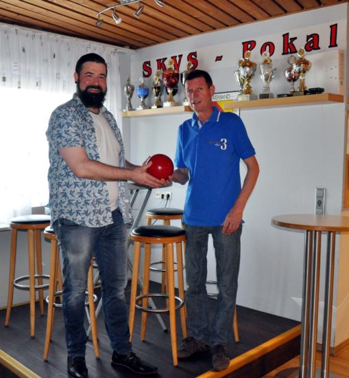 Auch »Bernd Siegesmund Bodenbeläge« freute sich über die Qualifikation des SKC Unterharmersbach zum Deutschen Finale. Er drückt dem SKC Unterharmersbach die Daumen und unterstützt die 1. Mannschaft mit einer Kugelspende. Bei der Übergabe kommentierte der 1. Vorsitzende das Halbfinale so: »Die Geiseltaler Wölfe sind »alte« Füchse, die Wissen wie der Hase läuft! Doch wir werden auf der Hut sein und wie immer alles für unseren Erfolg geben!«.
