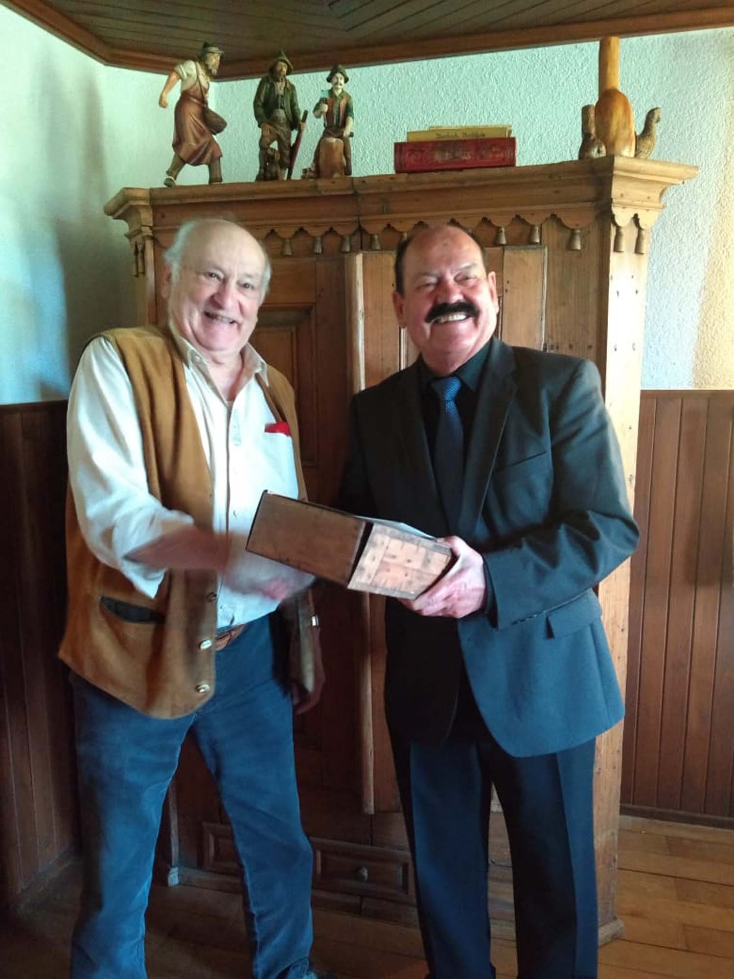 Über 50 Jahre gehört der Jubilar schon der Unterharmersbacher Bürgerwehr an. Der hochgewachsene Fahnenträger an der Spitze gewann die Sympathien der Zuschauer bei vielen Auftritten. Heute marschiert er bei offiziellen Anlässen als Ehrenfähnrich statt mit der Fahne nun mit einem Offizierssäbel mit. Auch sonst hat sich der Jubilar viele Verdienste für die Bürgerwehr erworben. In seinem Hof baute er eine Maschine, angetrieben über Transmissionen, um die schwarzen Uniformkittel für Wind und Wetter mit Bienenwachs zu präparieren und den Leinenstoff durch Gewichte und Reibung glänzend werden zu lassen. Auch das Verpacken des Schwarzpulvers in Papiertütchen für die vielen Salven, geschah bei ihm in der Kuchi.