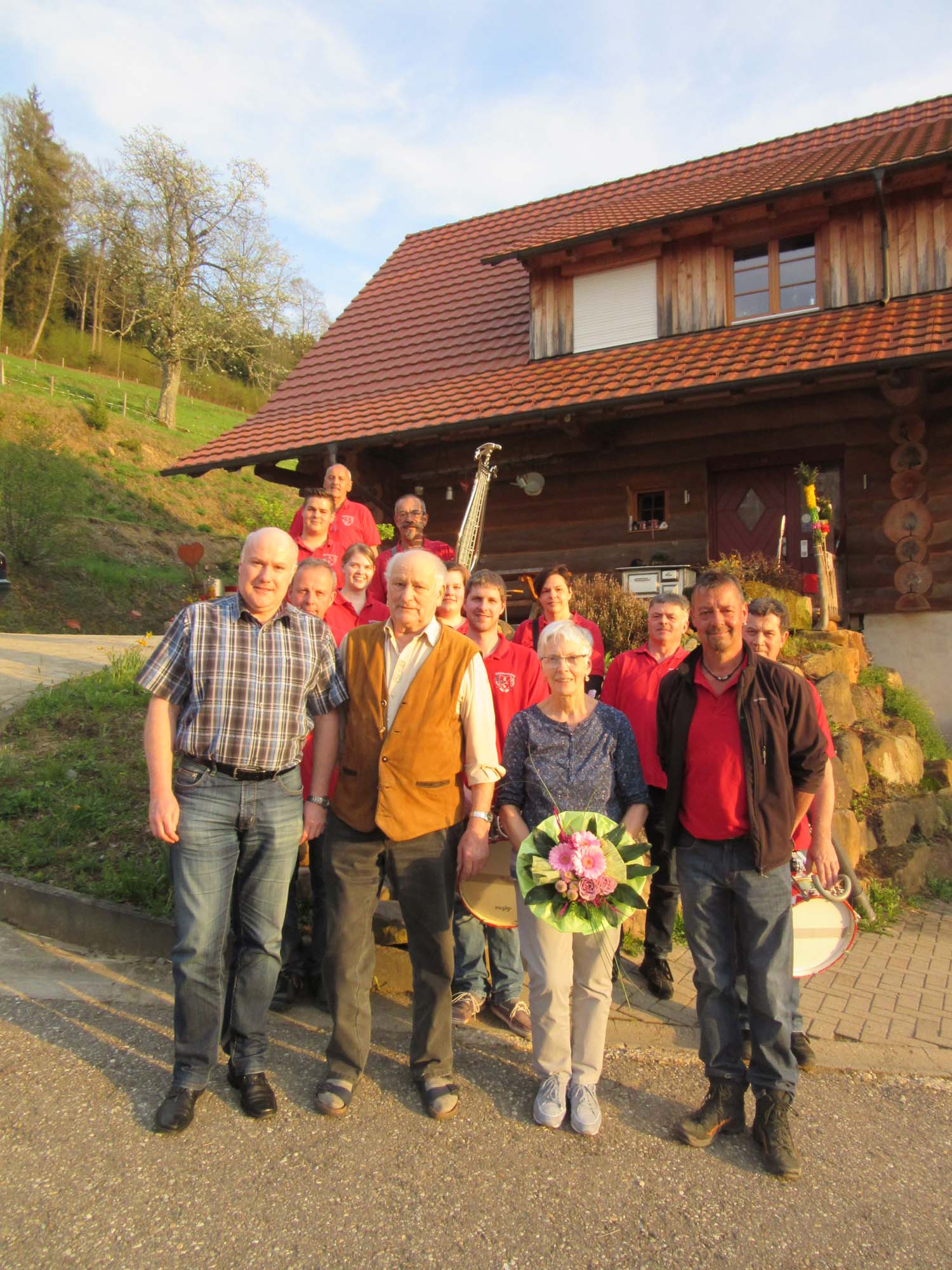 Zum runden Geburtstag kamen viele Gäste, Verwandte und Nachbarn auf den Berghof im Herrenholz. Für die Gemeinde gratulierte Ortsvorsteher Hans-Peter Wagner und der Spielmannszug der Bürgerwehr unter Leitung von Tambourmajor Josef Roth überraschte den Jubilar mit einem zünftigen Ständchen. Schon nachmittags waren die Alterskameraden der Bürgerwehr mit Ehrenkommandant Gottfried Gutmann an der Spitze zum Gratulieren gekommen. Sie alle fanden in der großen Stube und in der geräumigen Küche Platz. Mit dabei waren natürlich auch seine acht Enkel, darunter die beiden Enkel Gabriel Symphorian und Jonathan, Söhne des jetzigen Hofbauer Christian und seiner Frau Stefanie.
