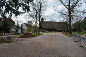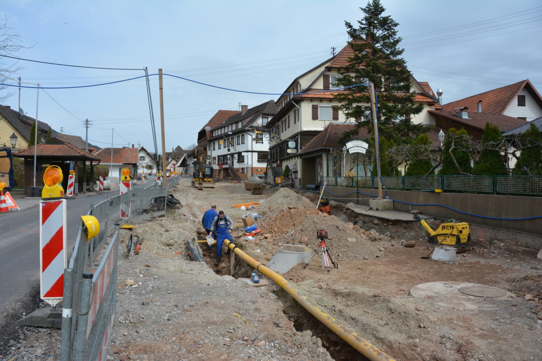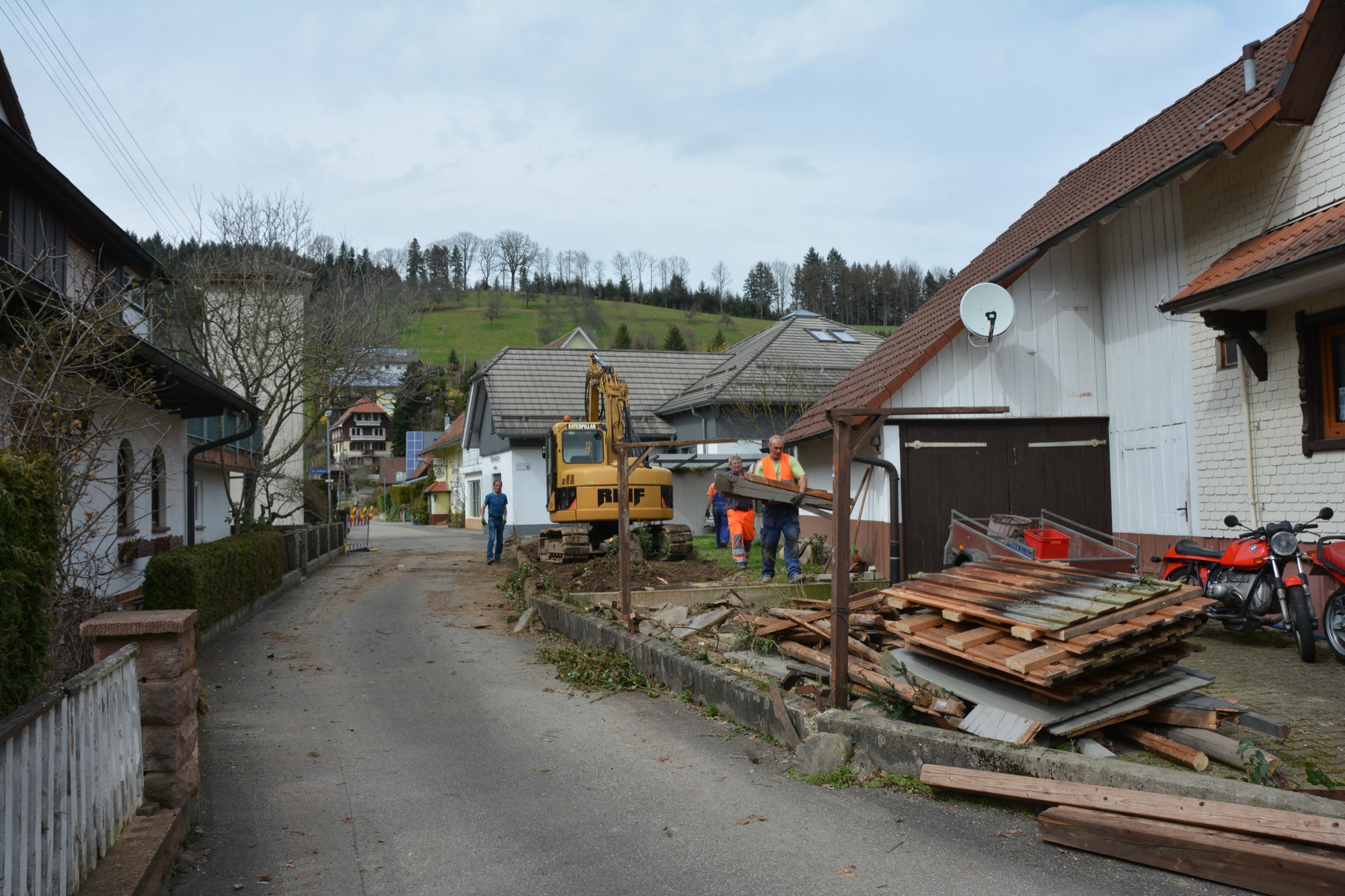 Foto: Hanspeter SchwendemannDer Ortskern von Unterharmersbach ist aktuell eine Großbaustelle. Wo zuvor Parkplätze und Vorgärten waren, fließt der Verkehr einspurig an der L94-Baustelle vorbei. Ab Anfang Mai biegt der Verkehr in Höhe des Gasthauses »Schützen« dann in Richtung Sportstättenstraße ab. Dass dies überhaupt möglich wurde, ist der Zustimmung der privaten Anlieger zu verdanken. Die Engstelle beim Anwesen Dürrholder konnte durch den Abbruch eines Nebengebäudes beseitigt werden.