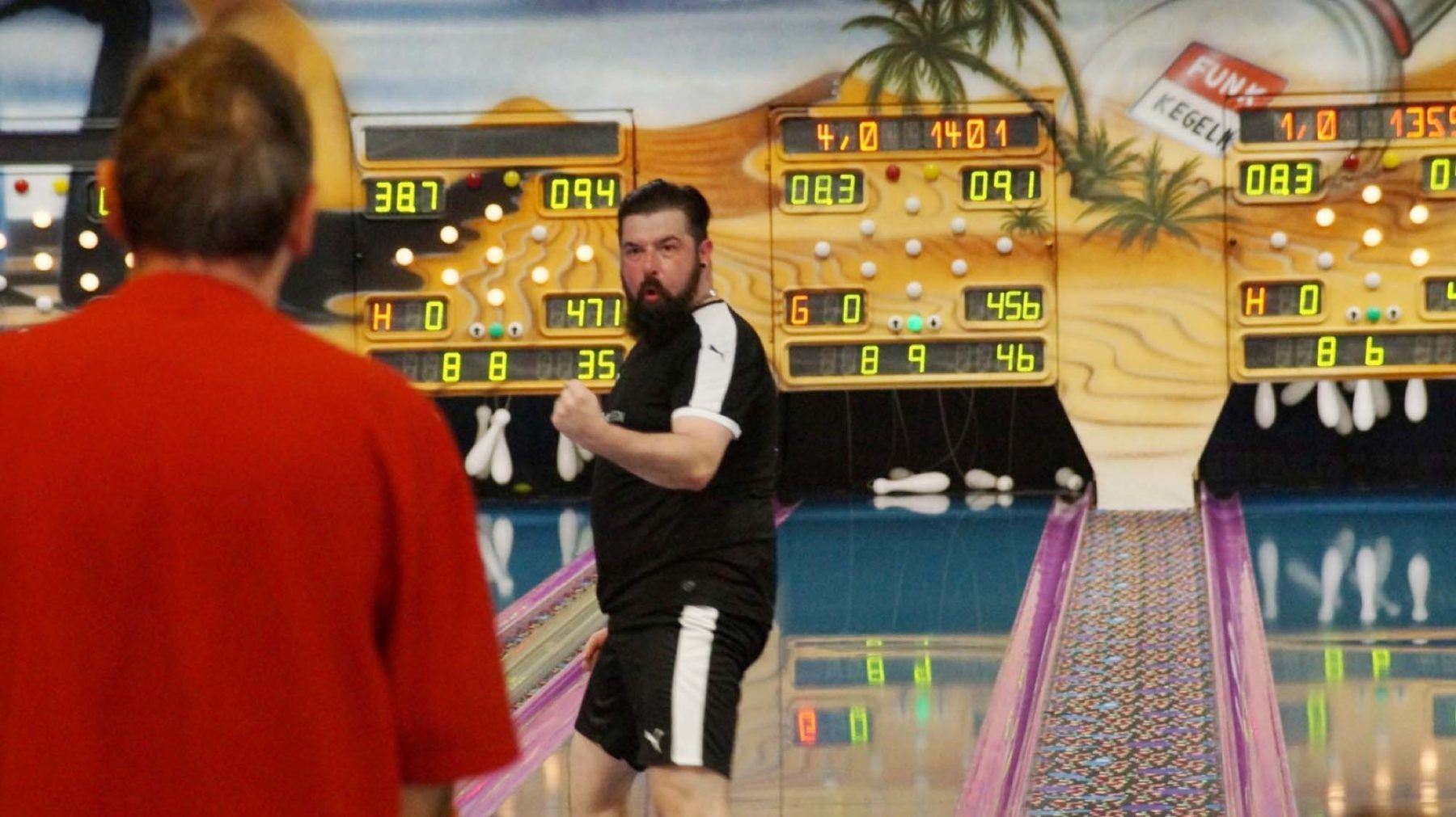 Das Spiel ging dann jedoch genauso nervös weiter. Die Müchelner spielten ebenso unter ihren Erwartungen, konnten Unterharmersbach immer wieder auf Distanz halten. Frédéric Koell (562 Kegel) konnte gerade noch Andreas Fritsche (556 Kegel) bezwingen während Pascal Dräger (577 Kegel) in einem heiß umkämpften Duell gegen Sven Tränkler (567 Kegel) punktete. Die Müchelner konnten die Fehler des Kontrahenten einen Tick besser ausnutzen als der SKC selbst. Zur letzten Bahn führten die Anhaltiner mit über 60 Kegel, das Spiel schien für Unterharmersbach so gut wie verloren. Als jedoch dann Maurice Sobott (539 Kegel) im bereits verlorenen Duell gegen Matthias Noack (535 Kegel) dessen fatalen Einbruch von 110 Kegeln zur Aufholjagd ummünzte, purzelte deren Vorsprung unaufhaltsam. Die Geiseltaler Wölfe schienen stehend K.O. und wehrten sich gegen den drohenden Knock-Out. Der Classic Treff war zum Hombacher Hexenkessel geworden, es hielt keiner mehr auf den Sitzen. Im offenen Schlagabtausch war in den letzten Würfen alles drin. Nach der letzten Kugel starrten alle gebannt auf die Endanzeige. In der dann mucksmäuschenstill gewordenen Keglerhalle prangte dann »Minus 12« gegen Unterharmersbach auf, Spieler sackten enttäuscht in die Knie, Zuschauer schlugen die Hände ungläubig über den Kopf und schauten sich ratlos an. Nach einem hochdramatischen, nervenaufreibenden und stimmungsvollen Spiel heulten die Wölfe erleichtert wieder auf.