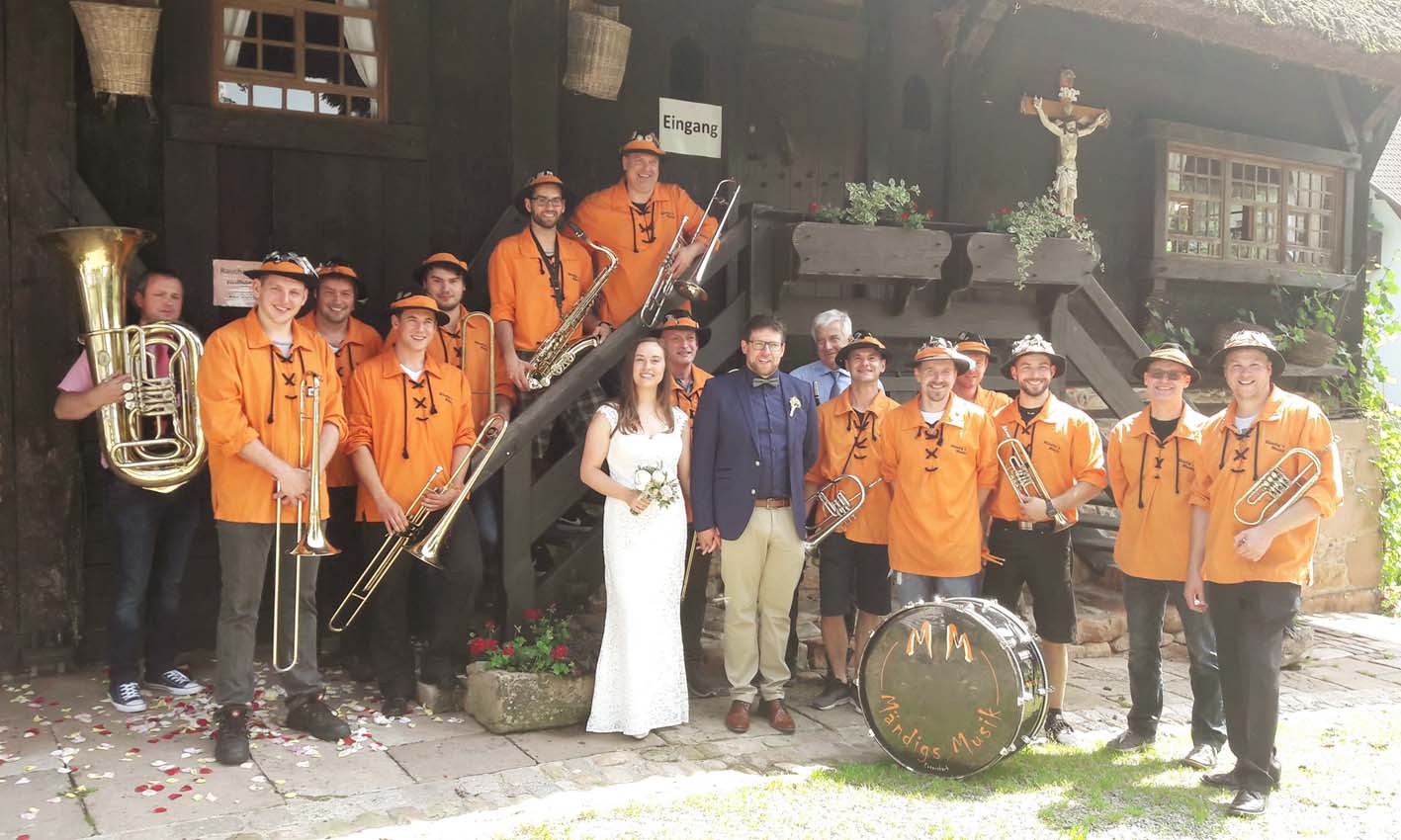 Wenn einer aus ihren Reihen heiratet – und das an einem Montag – dürfen sie nicht fehlen: die Mändigs-Musiker mit dem frisch gebackenen Paar, Marina und Stephan Isenmann.