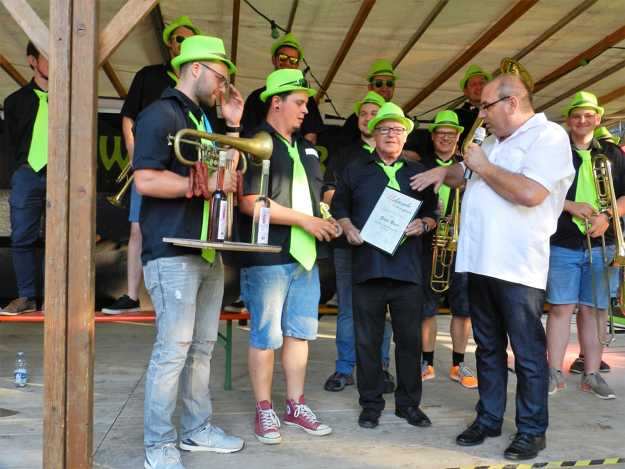 Rauer gehört seit 1992 den Eckwaldpupern als aktiver Musiker an. Mit seinen 79 Jahren ist er als exzellenter Trompeter immer noch eine große Stütze. So stand er auch beim Jubiläum inmitten seiner Kameraden beim Auftritt der Eckwaldpuper auf der Bühne. Vorsitzender Daniel Behrschmidt würdigte unter Riesenbeifall der Besucher Günter Rauers große Verdienste. Als Geschenk erhielt er aus den Händen des musikalischen Leiters Joel Braun zwei Fläschle stärkende Wässerle aus heimischem Obstbau und eine Ehrenurkunde. Rolf Köhler von RWK Privatmedia überreichte im Auftrag von dem bekannten Narrenreporter Mathias Drescher, Hitradio Ohr, einen Ehrenpokal. In diesem Moment schaltete sich der Narrenreporter und Pressesprecher des Narrenbundes Ortenau per Übertragung auf dem Festplatz zu. Er betonte, dass Günter Rauer für alle Guggenmusiker ein Vorbild sei als mit Abstand ältester aktiver Guggenmusiker des Ortenaukreises und weit darüber hinaus. Mathias Drescher wünscht ihm noch viele schöne Jahre bei den Unterharmersbacher Guggenmusiker und versprach als sein Geschenk beim Open-Air-Festival im kommenden Jahr persönlich dabei zu sein.