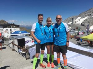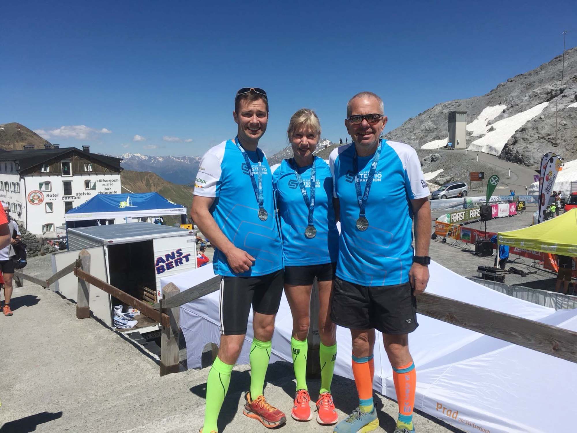 Zunächst jedoch hatten sich alle erstmal vorgenommen gesund im Ziel auf dem Pass anzukommen. Als einer der ältesten Läufer im Teilnehmerfeld konnte dann Rolf Schrempp nach 6:16 Stunden den dritten Rang in der Altersklasse 65 belegen mit einem komfortablen Vorsprung von fast zwei Stunden! Aufgrund der bisherigen Resultate bei den alpinen Bergmarathons konnte Rosi Knäble aus Niederschopfheim durchaus zu den Favoriten in der Altersklasse 60 gezählt werden. Obwohl sie die älteste Läuferin war, errang sie dann auch souverän die Goldmedaille mit 6:05 Stunden, ihr Vorsprung vor der Zweitplatzierten betrug eine Stunde. Ihr Ergebnis hätte auch für den Sieg in der nächstunteren Altersklasse gereicht und sogar für den zweiten Platz in der Altersklasse 50. Belohnt wurden die drei Ersten der Altersklassen mit einem großen Korb voll mit Köstlichkeiten aus dem Vinschgau. Rund 30 Läufer waren in der sehr starken Gruppe der 35 – 40-Jährigen angemeldet. Hier konnte Daniel Knäble mit 5:46 Stunden Platz 19 belegen, in der Gesamtwertung der über 300 Starter war dies Platz 100. Immer noch für den 200. Gesamtplatz reichte es für Bernd Ehrhardt mit 6:34 Std. Trotz der über 20 Läufer in der Altersklasse 60 reichte es ihm damit auf Platz 10.