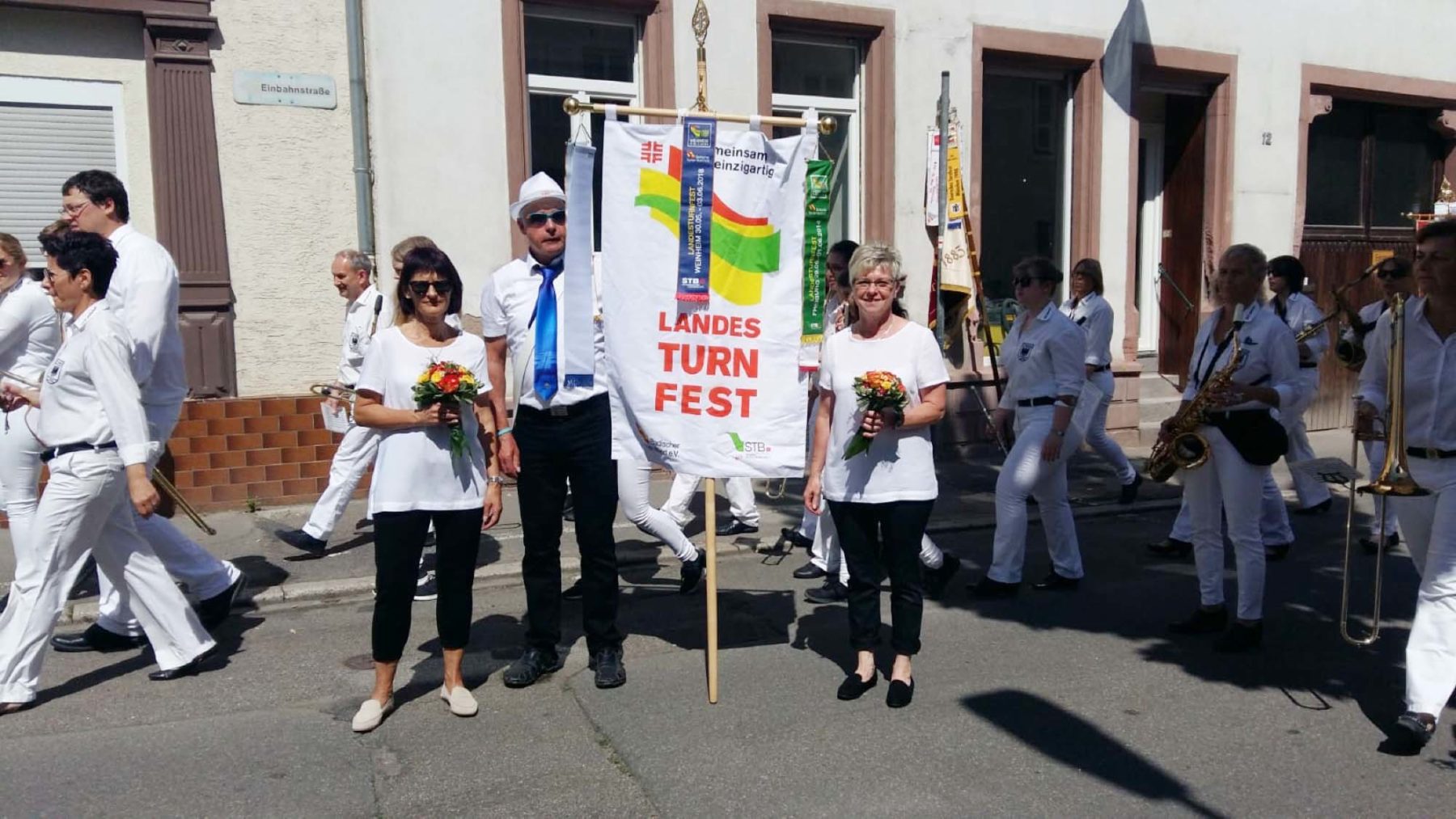 Als Abschluss des Badischen Landesturnfest zog am Sonntag Vormittag ein farbenfroher Festumzug durch die schöne Altstadt von Weinheim. Sowohl die Landesturnfestfahne als auch der Gaubanner des Ortenauer Turngaus wurde von je zwei Turnerinnen des TV Unterharmersbach begleitet.