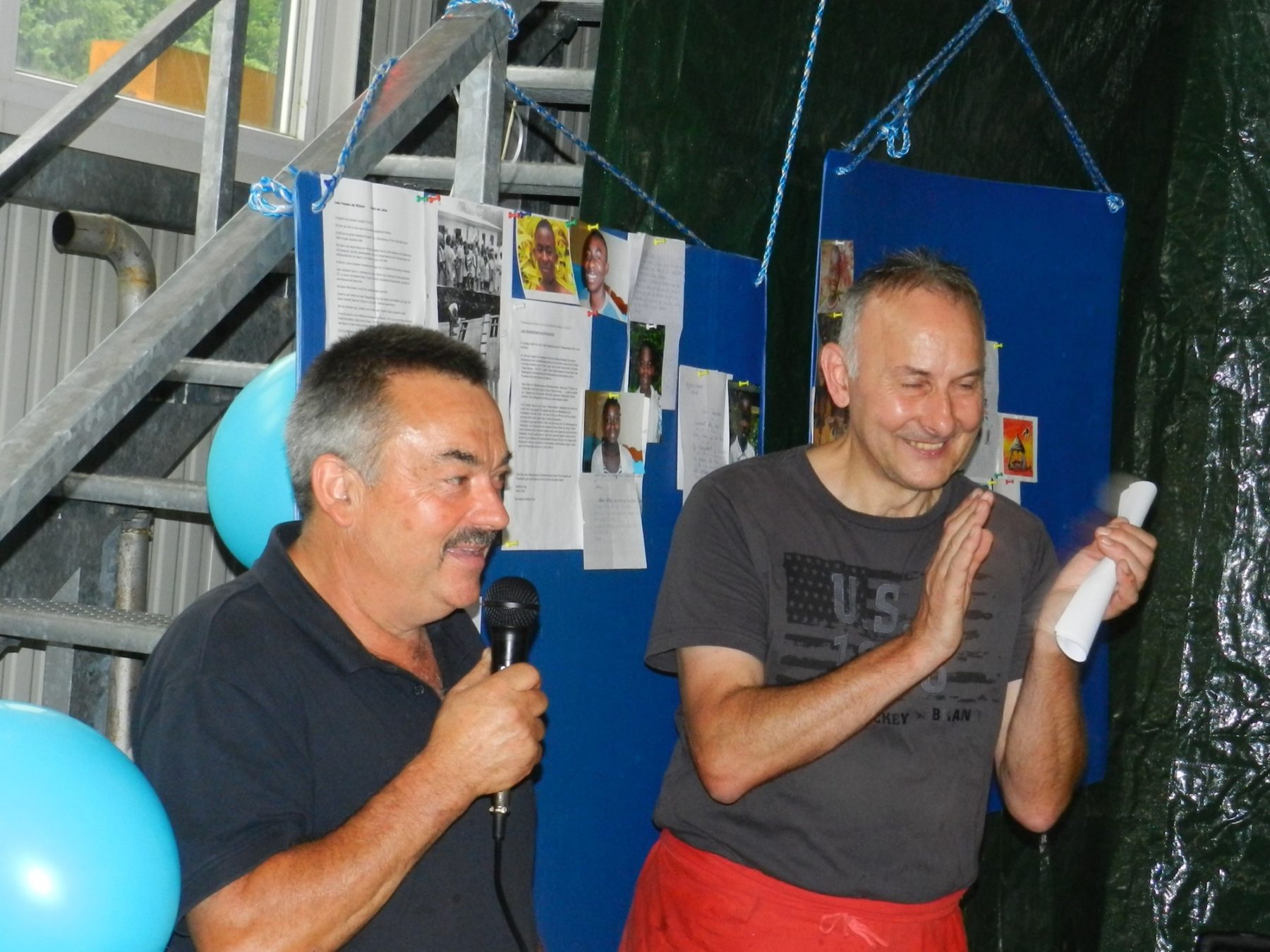 Abschließend dankte Manfred Schwarz den Sponsoren, besonders Sepp Lehmann für die Zurverfügungstellung seiner Halle und der Hopsburg. Und auch, dass er all die Jahre selbst noch beim Fest hinter der Theke stand und Bier ausschenkte. Ein dickes Dankeschön gab’s auch für den Grünacher Hufschmied Stefan Bürkle, der das Wildschwein gespendet hatte sowie für die Raiffeisen Kinzigtal, die die Theke, Tisch und Bänke zur Verfügung gestellt hatte. Der Dank galt auch der riesigen Helferschar, die in diesem Jahr wieder mitgeholfen hatte, ein so schönes Jubiläumsfest für einen guten Zweck zu feiern.