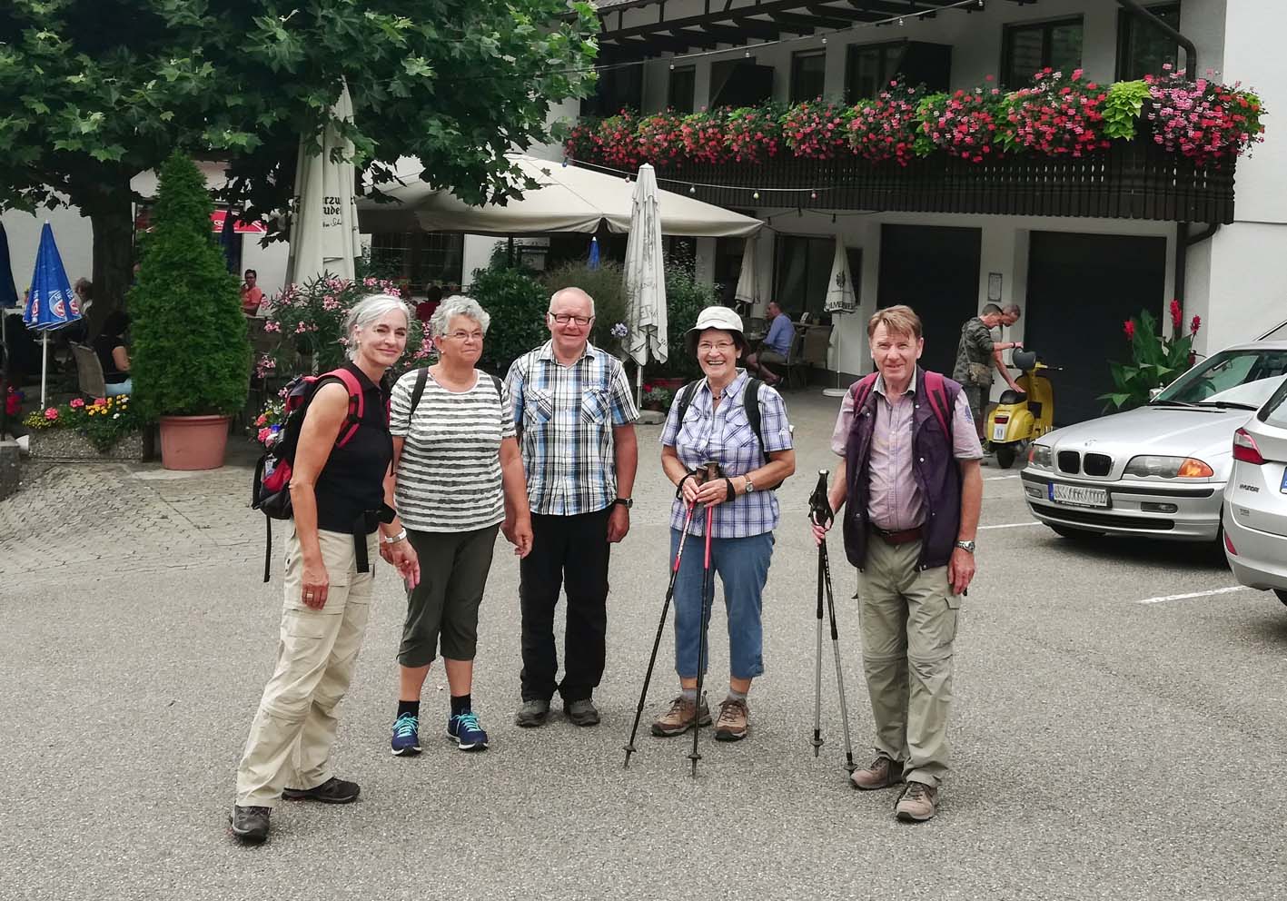 2. Weltkriegs elf Soldaten gefallen sind. Etwa zur Hälfte der Strecke wurde eine kurze Rast in der Berggaststätte »zur Einkehr« eingelegt. Gestärkt ging es auf die andere Talseite kurz durch den Wald, vorbei an der Waldköpfel Hütte und dann durch Reben. Hier gab es trotz des bewölkten Wetters Aussichten ins Rheintal, und sogar das Straßburger Münster war zu erkennen. Nach einem kurzen Abstecher in die Fatimakapelle führte die Wanderung zum Ausgangspunkt zurück. Am Ende der Wanderung gab es, wie vom Wanderführer Roland Wiegert angekündigt, eine Einkehr im »Gaisbacher Hof«.