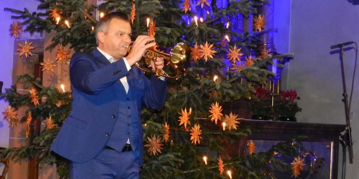 Dann war es soweit: Man hätte eine Stecknadel fallen hören können, als Markus Wolfahrt durch den Mittelgang schritt und mit seinem Flügelhorn herrliche Klangbilder in den Raum der Kirche zauberte, die mit ihren weichen Melodien der »Canto il sole« die Besucher zum Träumen einluden. Passend dazu: Wo an den Wänden normalweise die Heiligenfiguren auf die Besucher herabschauen, leuchteten große Sterne in allen Farben, die mit der wechselnden, aber dezenten Beleuchtung im Chorraum einen wunderbaren Weihnachtszauber bildeten.